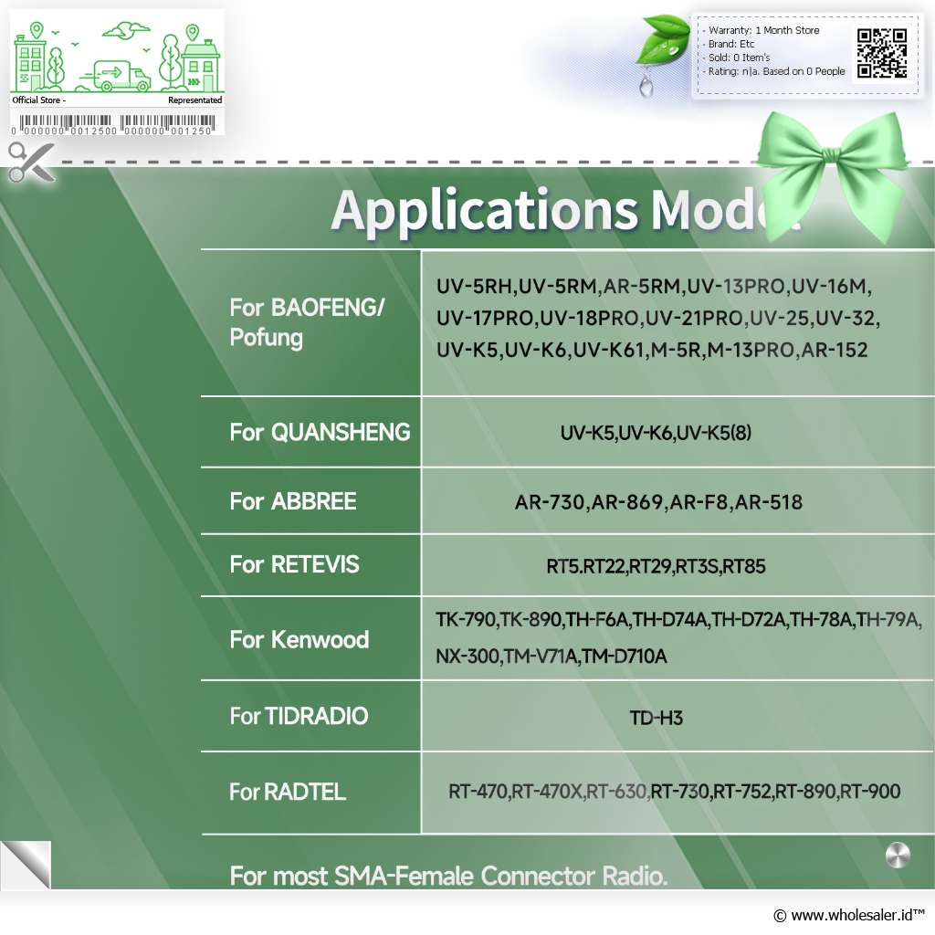 | Kompatibilitas Luas untuk HT Populer Punya HT Baofeng, Quansheng, atau merek lain dengan konektor SMA-FemaleAntena ini bisa langsung dipasang dan digunakan! Kompatibel dengan model populer seperti UV-5R, UV-32, dan UV-K5, kamu nggak perlu repot cek kecocokan. |