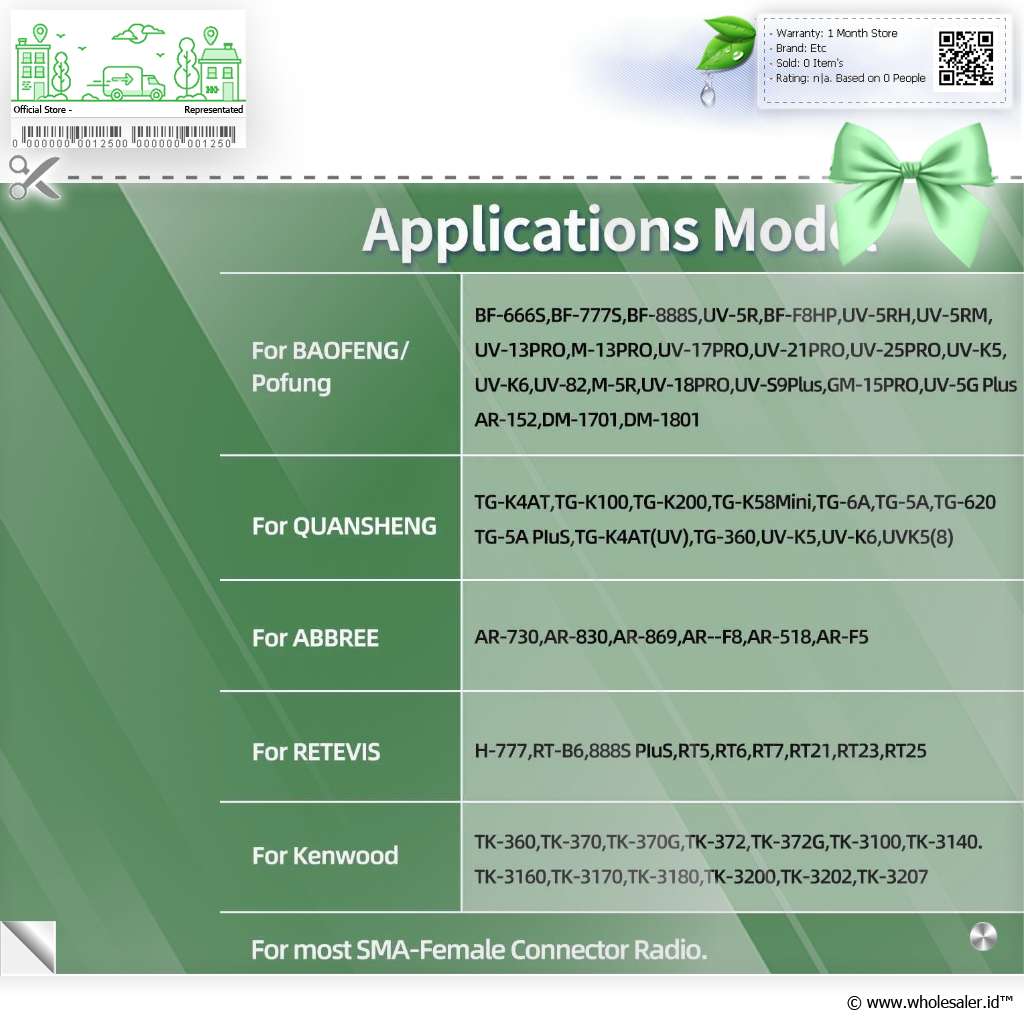 | Kompatibilitas Luas Anda bisa menggunakan antena ini untuk berbagai jenis walkie talkie, di antaranya adalah: |