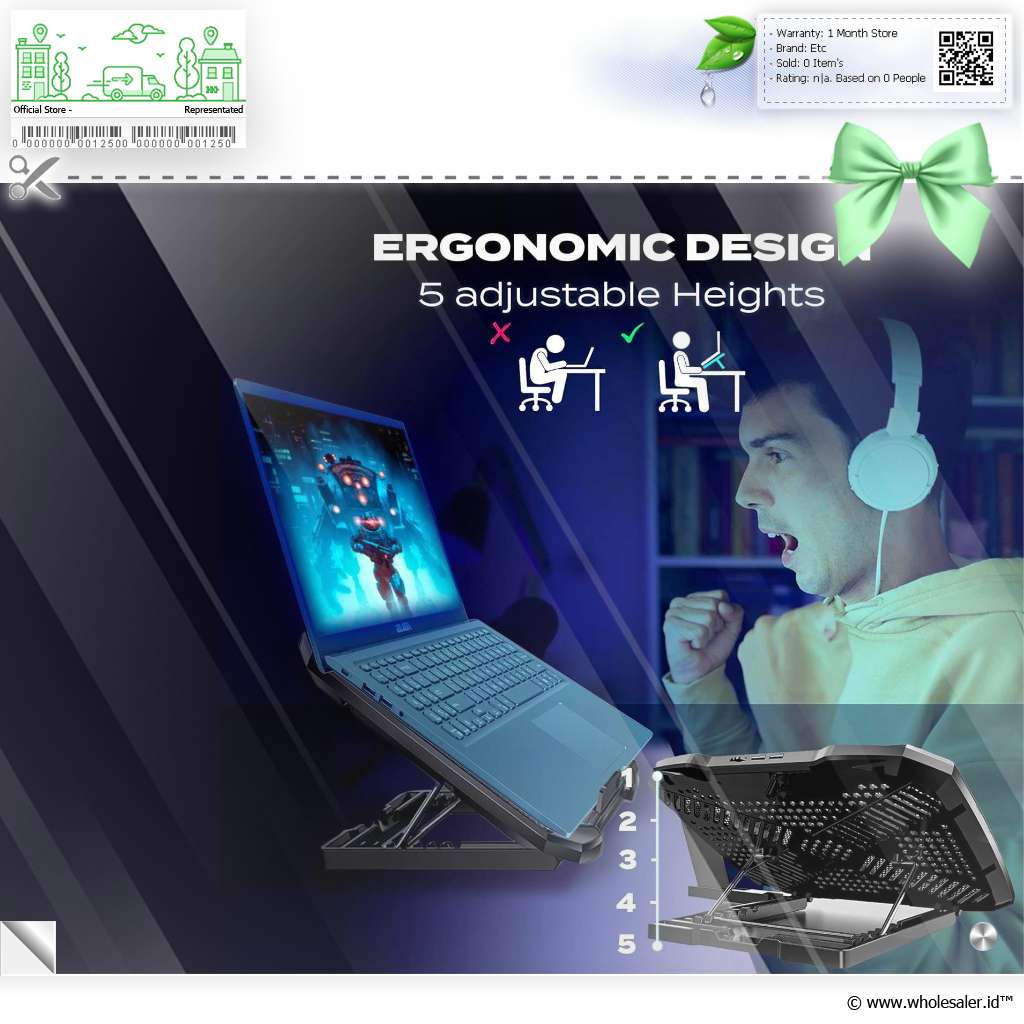 | Ergonomi Maksimal Untuk menjaga kenyamanan dan postur yang baik, cooling pad ini menawarkan pengaturan ketinggian hingga 5 tingkatan. |