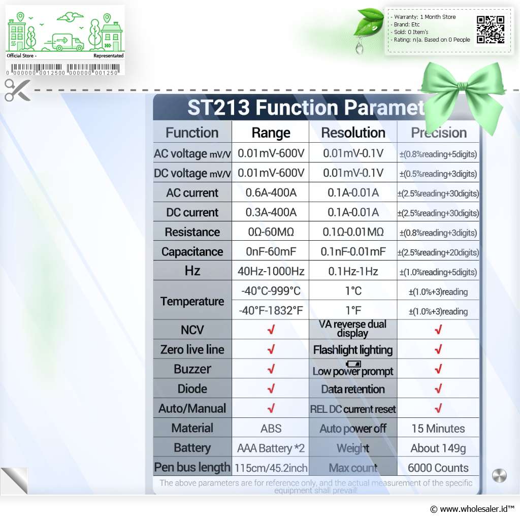 | Lebih Detail Lebih Akurat ANENG ST213 menawarkan tampilan hingga 6000 digit yang tercermin di layar LCD-nya, memberikan kemampuan membaca nilai tegangan maupun arus dengan lebih halus dan presisi. |