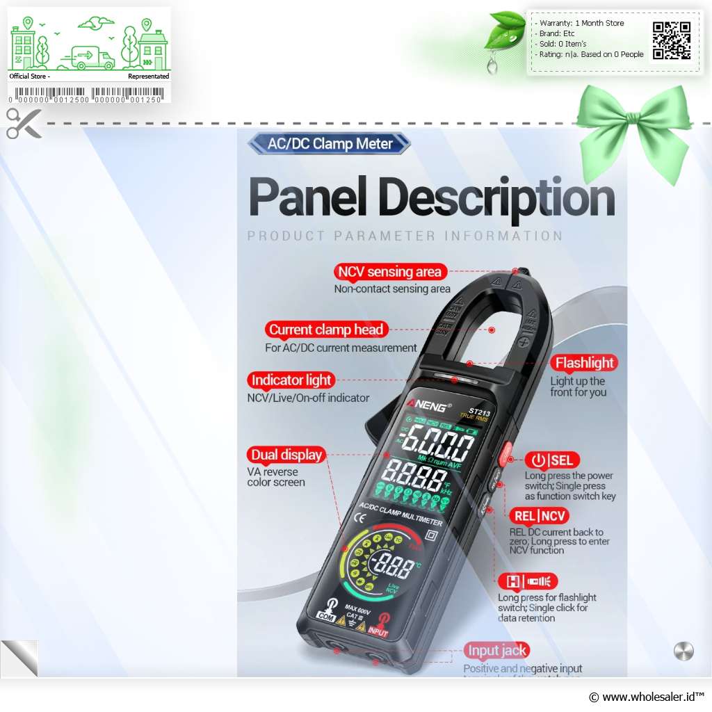 Clamp meter ANENG ST213 dirancang sebagai alat ukur listrik multifungsi yang cocok bagi teknisi profesional maupun pengguna DIY yang menginginkan perangkat yang handal, portabel, dan mudah digunakan. Dengan resolusi tampilan hingga 6000 digit, mampu mengukur tegangan dan arus DC/AC, dibekali layar ganda, fungsi deteksi tegangan tanpa kontak (NCV), auto shutdown otomatis, serta menggunakan baterai AAA yang mudah diganti. Tidak hanya tespen, Anda bahkan dapat menggunakan clamp untuk pengukuran yang lebih mudah dan aman