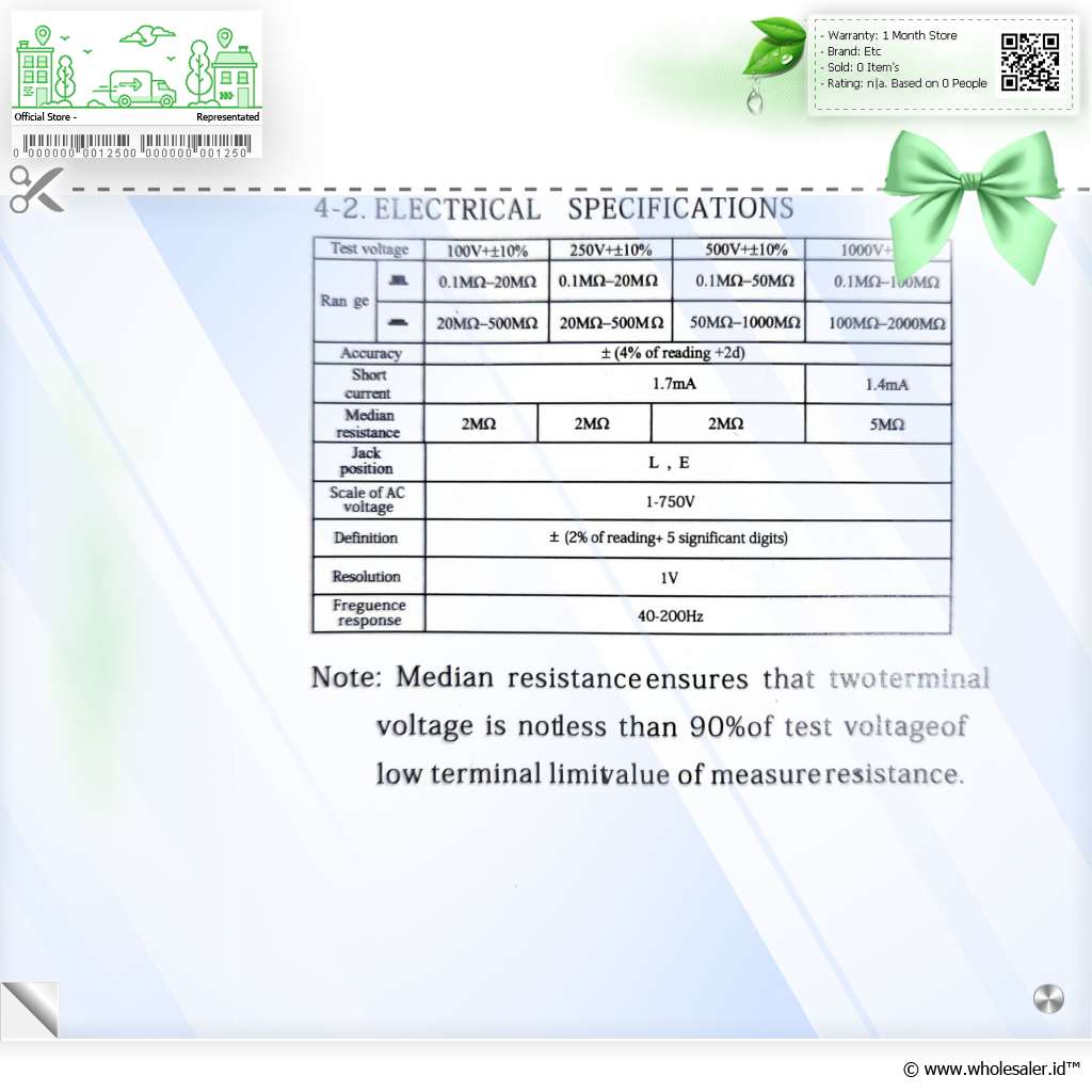 Pengukuran | : | Output Voltase 100 - 1000 V Rentang Resistansi 0.1 MOhm100 MOhm dan 20 MOhm2000 MOhm Frekuensi Respon 40 - 200 Hz Skala Voltase AC 1 - 750 V Resolusi 1 V Definisi (2% dari Pembacaan + 5 Digit) Akurasi (4% dari Pembacaan + 2 Digit) Arus Pendek 1.7 mA dan 1.4 mA Median Resistensi 2 MOhm, 5 MOhm |