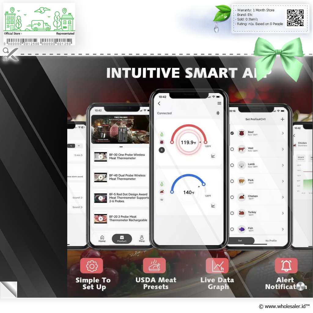 Masak jadi lebih cerdas dan presisi dengan BFOUR Smart Bluetooth Thermometer, alat pengukur suhu profesional yang memadukan akurasi tinggi dan teknologi nirkabel mutakhir. Dilengkapi dual probe hitam dan putih, koneksi Bluetooth 5.2 jarak hingga 100 meter, layar LCD elegan dengan screen holder cantik, serta baterai rechargeable 500 mAh berdaya tahan super lama, BFOUR membantu Anda mengontrol suhu makanan secara real time langsung dari aplikasi BF Home di smartphone Anda. Dengan desain tahan air IP67, termometer ini siap digunakan di dapur, panggangan, atau bahkan BBQ outdoor tanpa khawatir.