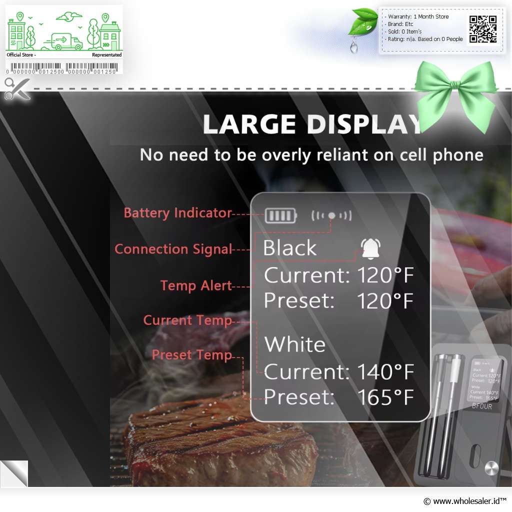 | Akurasi Tinggi BFOUR memberikan hasil pengukuran yang presisi dengan range suhu 0 - 100C dan tingkat akurasi 1C, sehingga Anda dapat memantau suhu makanan Anda dengan sempurna. |