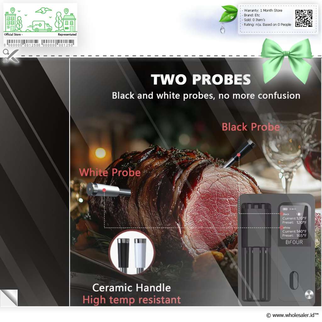 | Dual Probe Hitam dan Putih Berbeda dari termometer biasa, BFOUR menggunakan dual probe, dua sensor logam terpisah berwarna hitam dan putih yang memungkinkan Anda mengukur dua titik suhu berbeda secara bersamaan. Misalnya, satu probe untuk suhu bagian dalam daging dan satu lagi untuk suhu oven atau grill. |