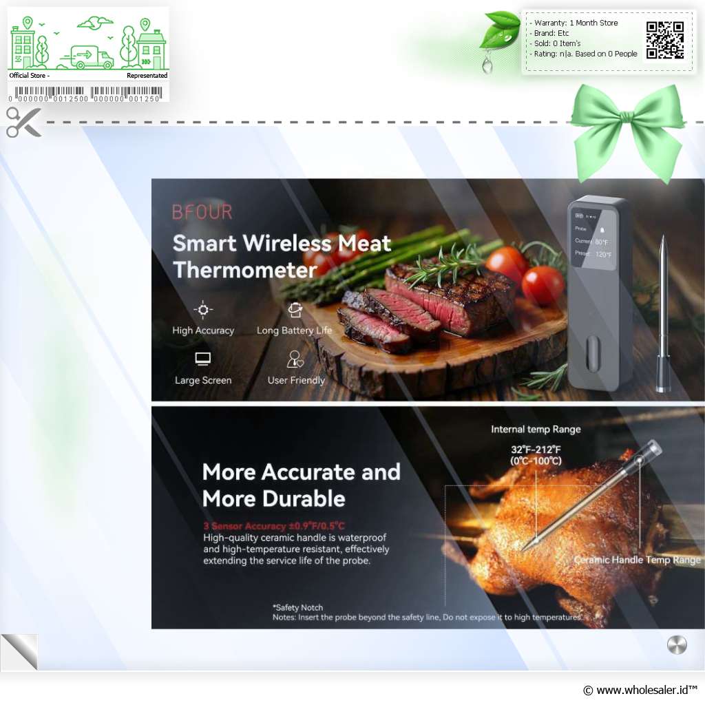 | Akurasi Tinggi BFOUR memberikan hasil pengukuran yang presisi dengan range suhu 0 - 100°C dan tingkat akurasi ± 0.5°C, sehingga Anda dapat memantau suhu makanan Anda dengan sempurna. Mulai dari mengukur suhu daging panggang, ayam, ikan, hingga cairan panas seperti kopi atau sup, semua bisa dilakukan dengan mudah dan cepat. |