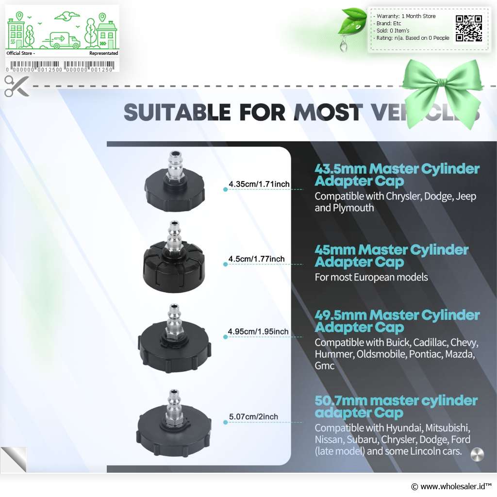 | Penggunaan Universal Satu set alat ini dilengkapi dengan empat Adaptor yang berbeda bentuk, yang memungkinkan kit ini digunakan pada banyak jenis kendaraan dengan ukuran dan bentuk reservoir minyak rem yang bermacam-macam. Adaptor-adaptor ini memastikan bahwa tutup reservoir rem bisa pas dan tertutup rapat selama proses bleeding, menghindari kebocoran udara dan memastikan tekanan terjaga dengan baik. |
