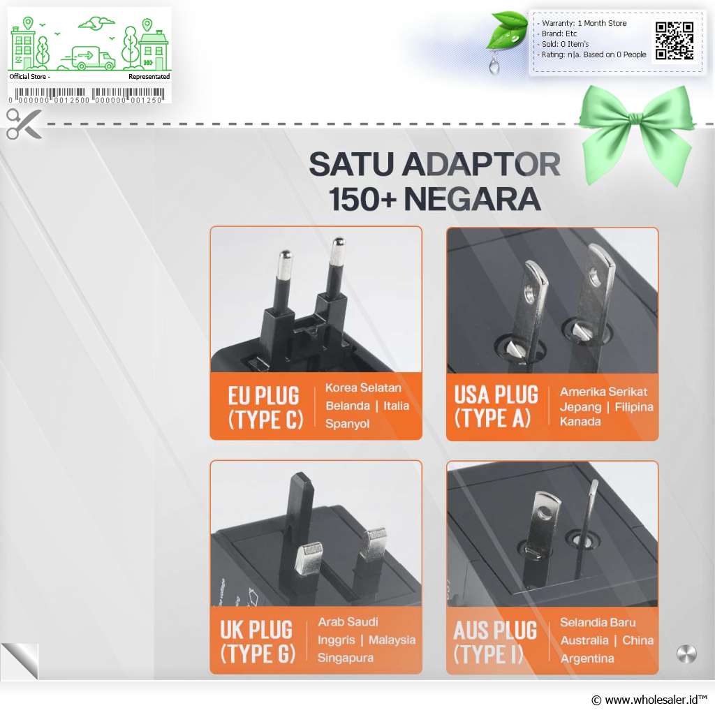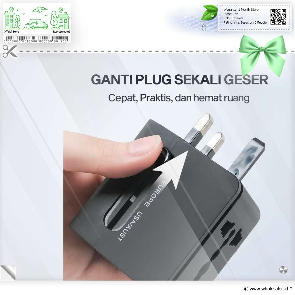 | Soket Universal Praktis Hadir dengan 4 pilihan plug, EU, UK, dan USA/AUS, Anda dapat menggunakan universal travel adaptor ini saat bepergian ke berbagai negara. |