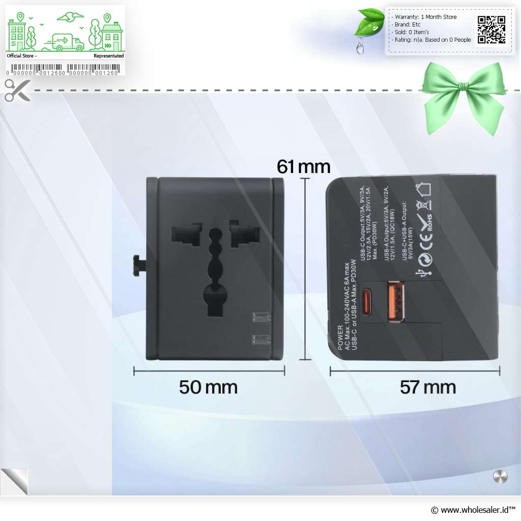 Informasi Produk COKYI Travel Adaptor Universal Plug EU UK US/AU 3A USB A USB C - 148-30W-1U1C