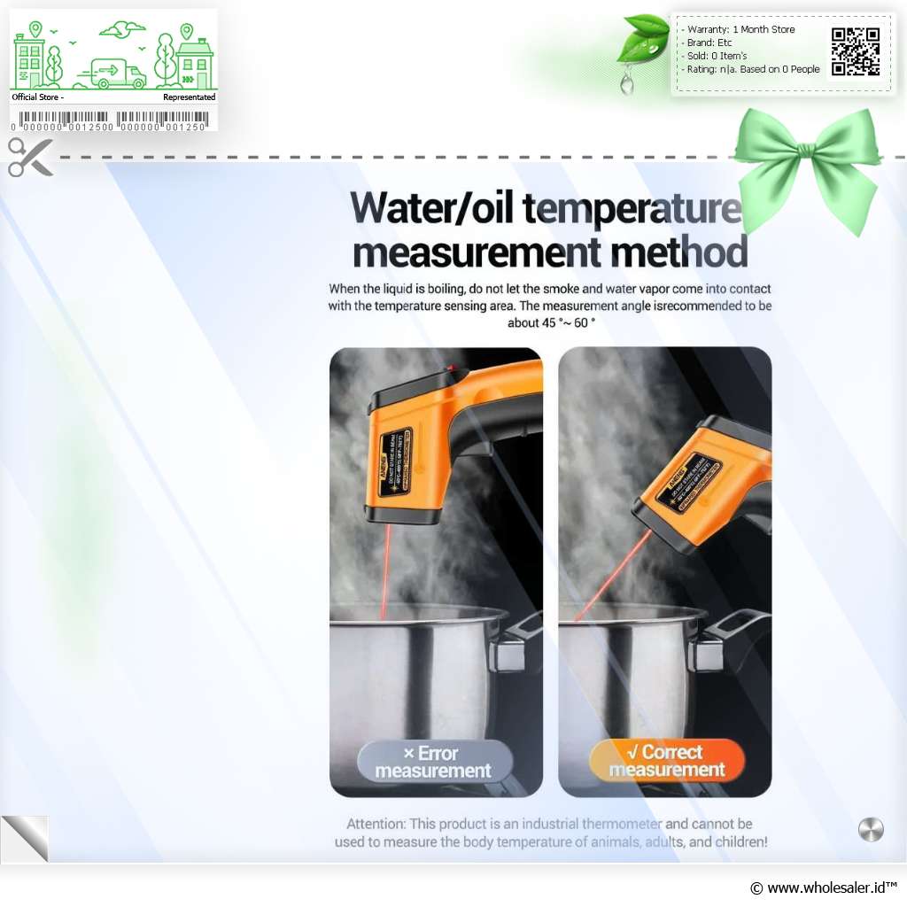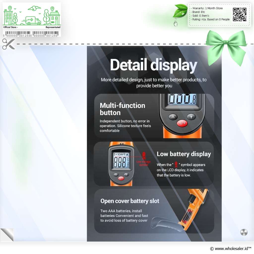 | Teknologi Infrared Terbaru Menggunakan teknologi infrared terkini untuk mengukur suhu dengan presisi tinggi. Dengan kemampuan non-kontak. Anda dapat mengukur suhu dari jarak yang aman tanpa harus menyentuh permukaan objek sehingga mengurangi risiko kontaminasi dan kerusakan. |