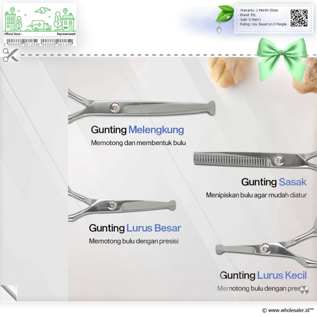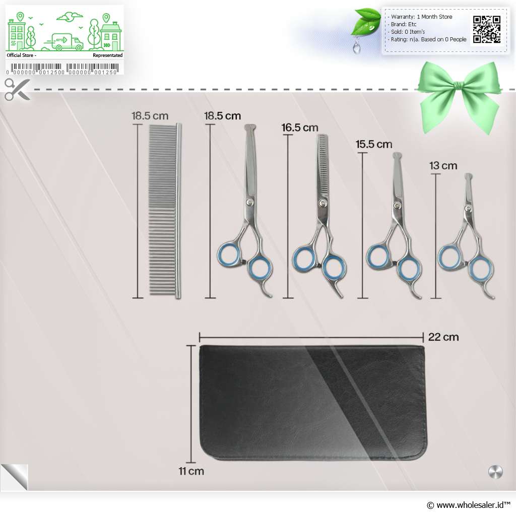 | Set Perawatan Lengkap Hadir dengan 4 model gunting, Anda bisa menggunakan set gunting grooming ini untuk memotong dan membentuk bulu anjing dan kucing sekaligus. Merapikan bulu juga lebih mudah berkat sisir bawaan. |