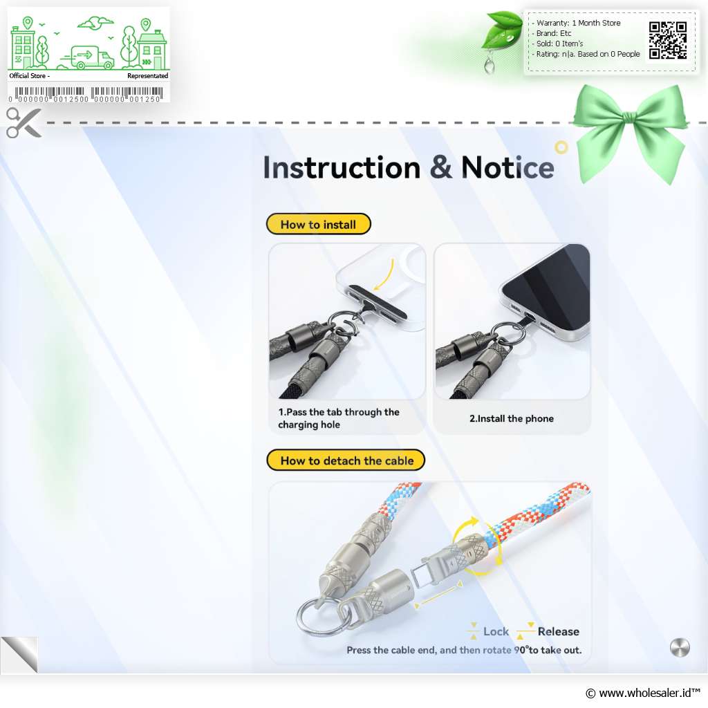 | Desain Aman, Modern, dan Mudah Dilepas Pasang Dengan sistem Quick Lock dan Quick Release, Anda cukup tekan dan putar 90 untuk memisahkan kabel. Dilengkapi T-shape tab untuk pengait ponsel yang kuat dan aman di pergelangan tangan Anda. |