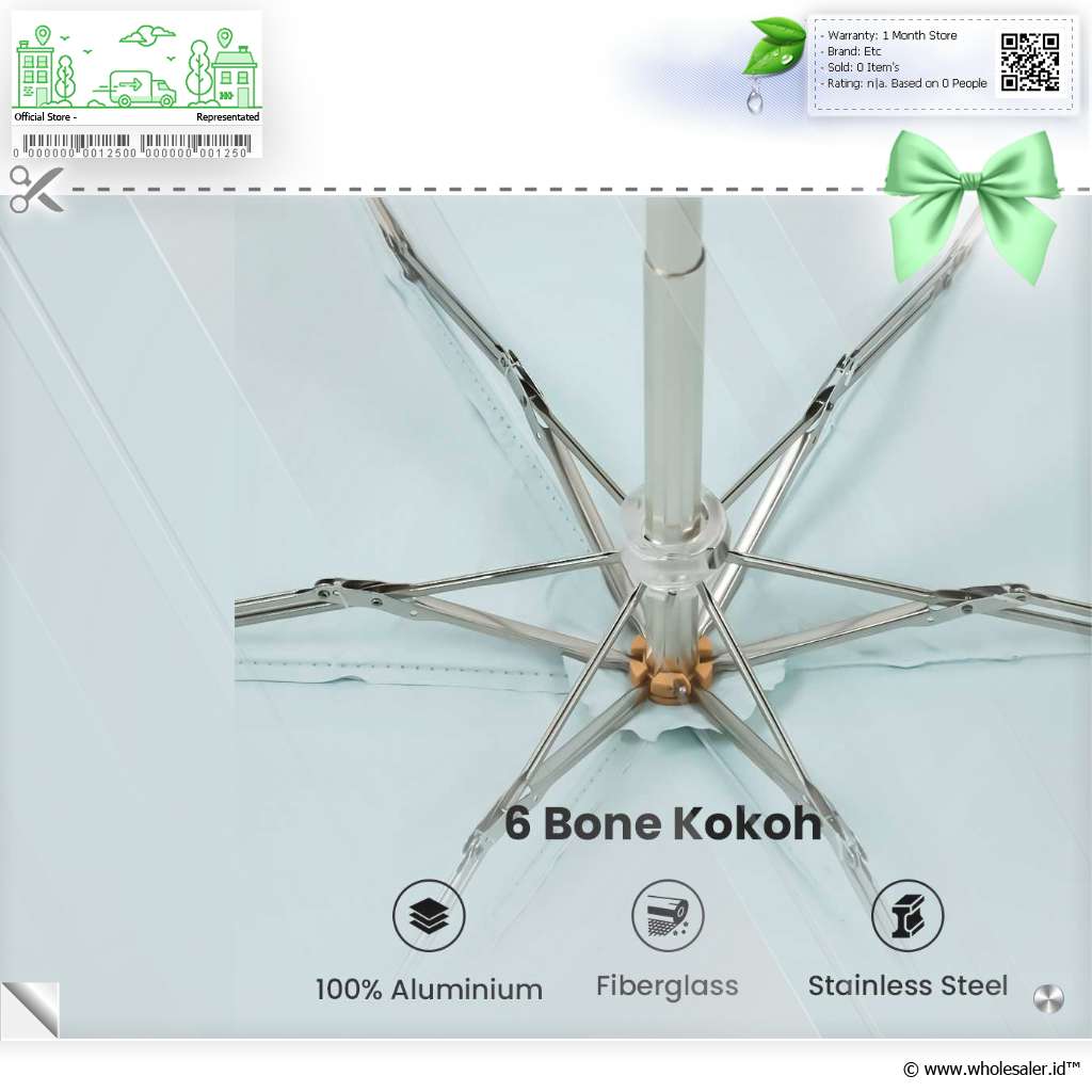 Rangka Kokoh Rangka dari kombinasi aluminium, fiberglass, dan stainless steel dengan 6 bone memastikan payung lipat kokoh dan dapat menahan embusan angin yang kuat. |