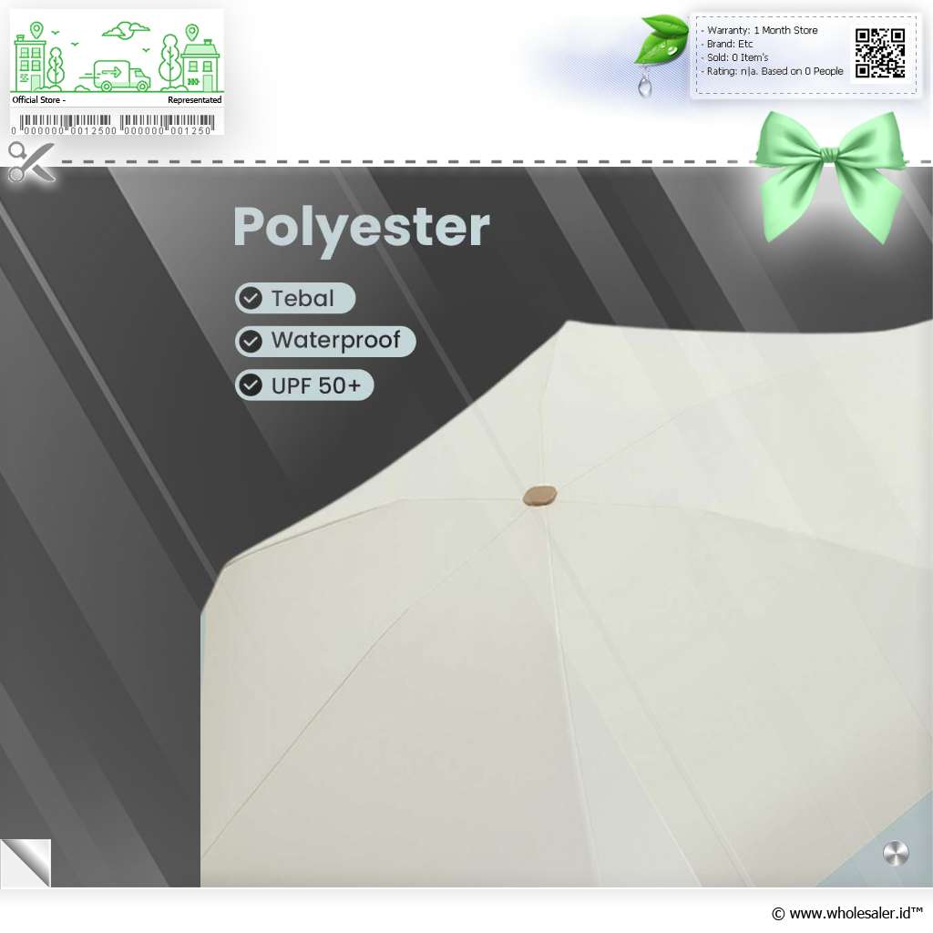 Polyester Tebal Bahan polyester yang digunakan tebal dan waterproof cegah bocor dan adanya air yang tembus ke dalam payung saat digunakan. Bahan ini juga dapat menghalau 99% sinar dan terik matahari.
