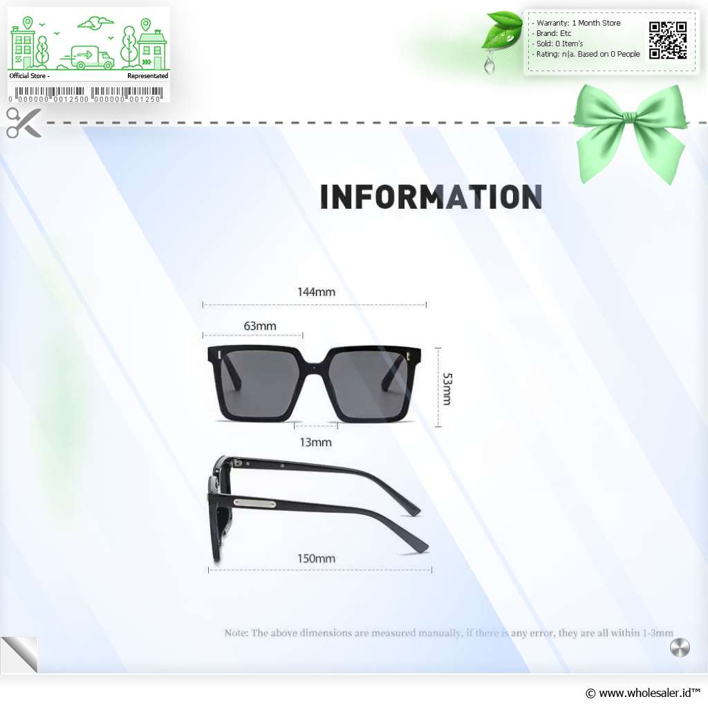 | Dimensi | : | Lebar Frame 144 mm Jarak Hidung 13 mm Lebar Lensa 63 mm Tinggi Frame 53 mm Panjang Tangkai 150 mm |