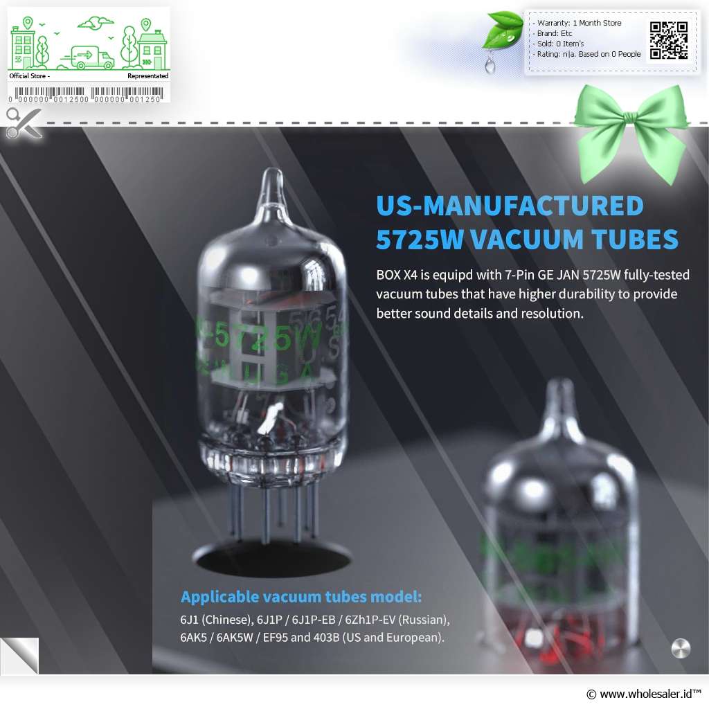 Tube Vacuum 5725W Tube vacuum 5725W yang digunakan pada Box X4 ini mampu memberikan suara yang lebih penuh dan terkesan 3 dimensi. Fitur ini membuat preamp cocok digunakan untuk melakukan mixing atau perekaman audio secara profesional. |