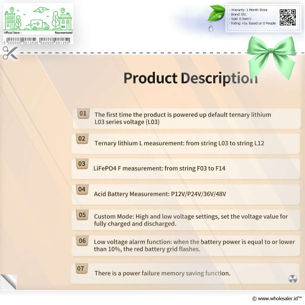 |  Aman dan Kenyamanan Tambahan  Tidak perlu khawatir tentang keamanannya, indikator kapasitas baterai sudah dibekali dengan perlindungan untuk mencegah kerusakan saat pemasangan kabel terbalik.  |