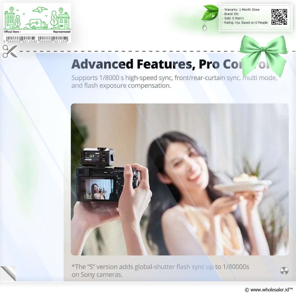 Tingkatkan kualitas pencahayaan fotografi Anda ke level profesional dengan flash camera dari Godox. Dengan dukungan transmisi nirkabel, sender groups, layar sentuh interaktif, HSS 1/80000 untuk global shutter, diffuser bawaan, dan baterai bawaan 900 mAh. Flash ini mampu memberikan kecepatan, presisi, dan fleksibilitas tinggi untuk kamera Canon, Sony dan berbagai jenis aksesori kamera lainnya.