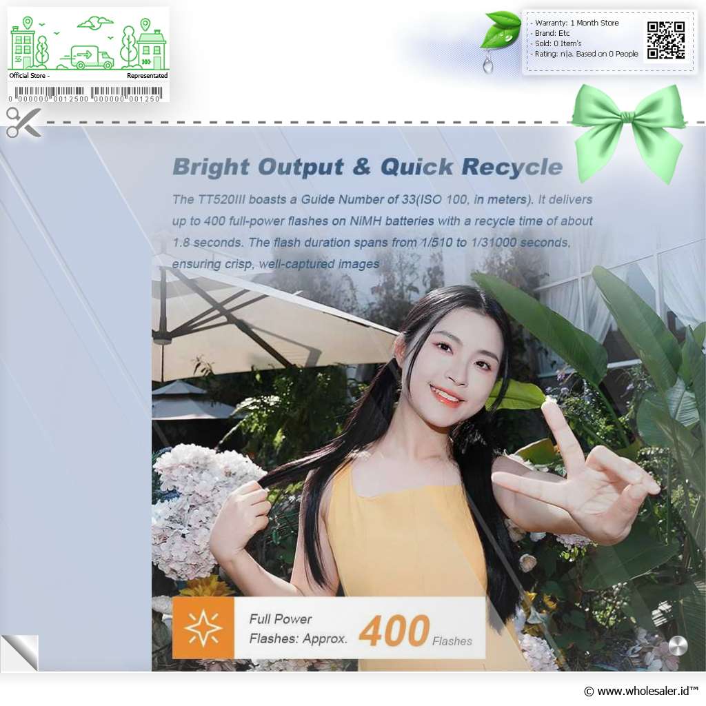 Efisiensi Energi & Ketahanan Tinggi Ditenagai oleh baterai NiMH atau alkaline, flash ini mampu menghasilkan hingga 400 kali kilatan penuh dengan konsumsi daya rendah. Desain bodinya kokoh dan ringan, memberikan stabilitas sekaligus portabilitas untuk penggunaan studio maupun luar ruangan. |