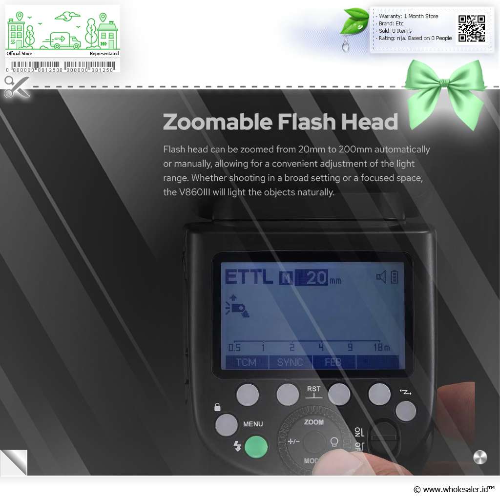 Kendali Penuh pada Area Pencahayaan Dilengkapi fitur zoom head adjustable dari 20 mm hingga 200 mm, flash ini memungkinkan Anda menyesuaikan sudut pencahayaan sesuai kebutuhan. Fokuskan cahaya untuk subjek spesifik atau sebarkan secara merata untuk hasil lembut dan natural. Teknologi ini membuat setiap kilatan lebih efisien dan sesuai dengan gaya pemotretan Anda. |