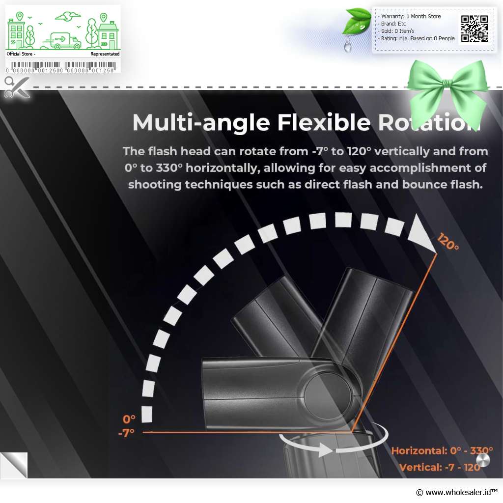 Fleksibilitas Pencahayaan Maksimal Kepala flash dapat berputar horizontal hingga 330 dan vertikal dari -7 hingga 120, memungkinkan Anda mengeksplorasi berbagai teknik pencahayaan seperti direct flash dan bounce light. |