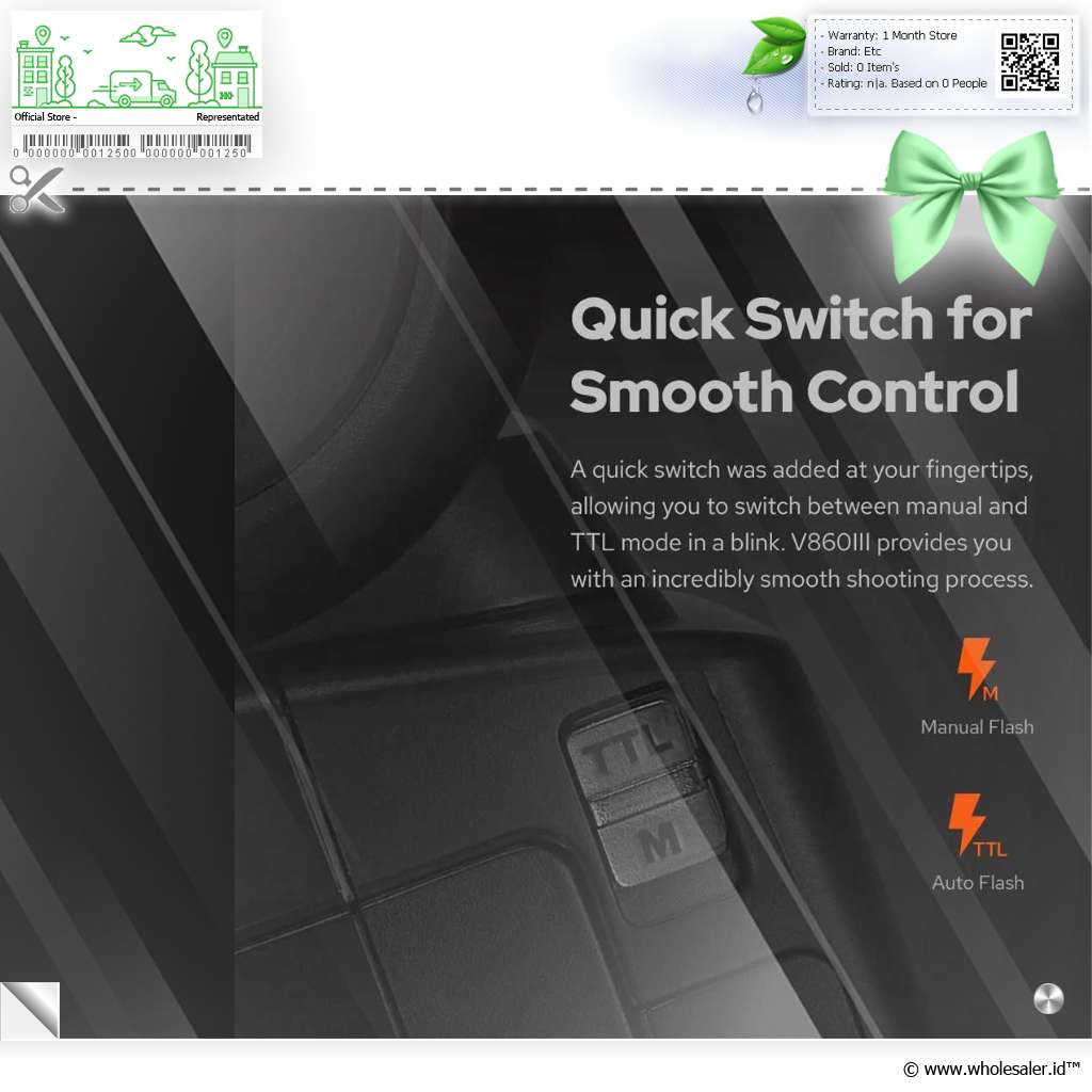 Daya Tahan Panjang 2980 mAh Ditenagai oleh baterai lithium berkapasitas besar 2980 mAh, flash ini mampu memberikan hingga 480 kali kilatan penuh dalam satu pengisian. Efisiensi energi tinggi menjaga performa tetap stabil bahkan dalam sesi pemotretan panjang, sementara sistem pendingin internal menjaga suhu optimal untuk penggunaan intensif. |