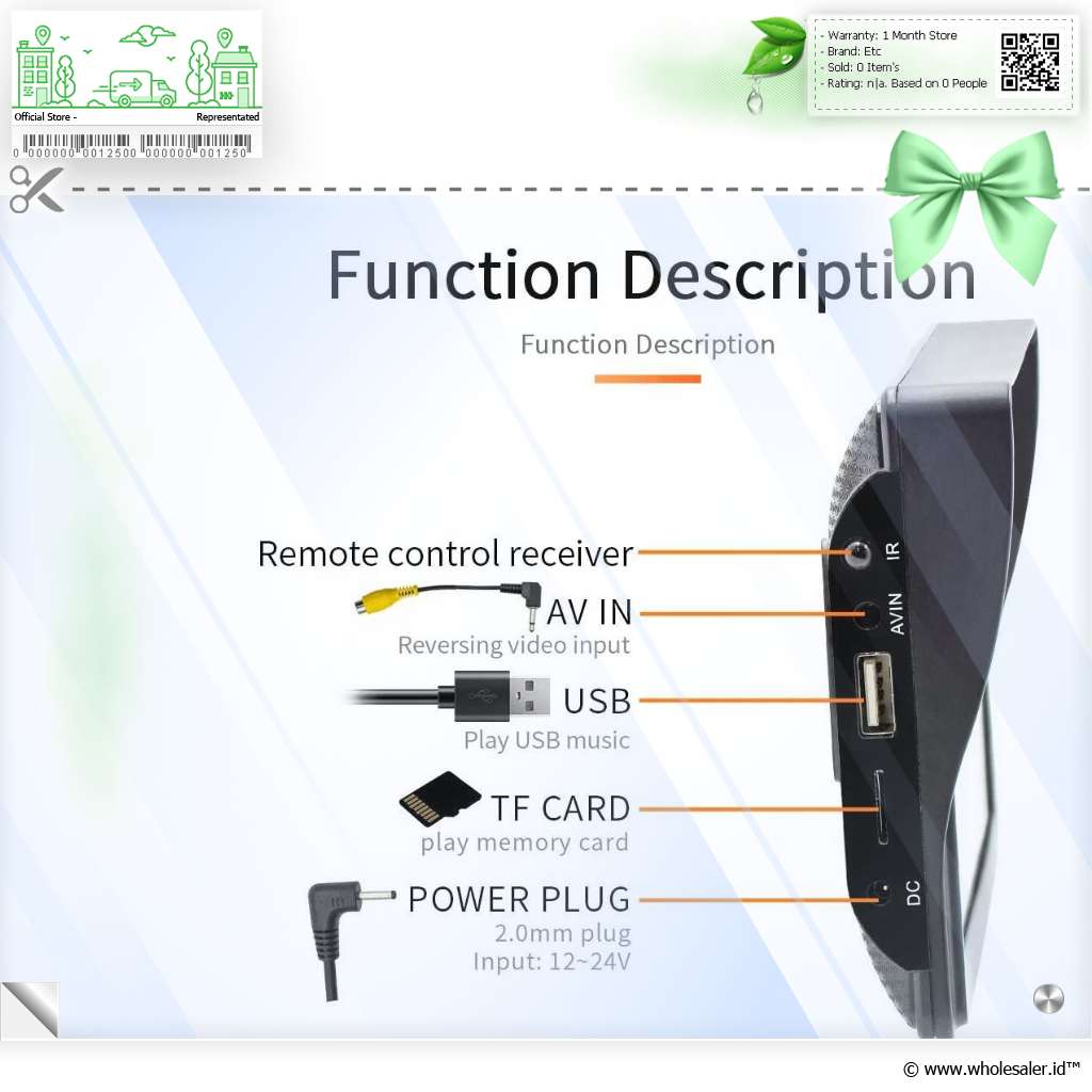 Dimensi | : | Layar Monitor 178 x 33 x 108 mm Diameter Holder Suction Cup 68 mm Panjang Kabel Cigarette Plug Sekitar 1 M Panjang kabel Video RCA Sekitar 190 mm |