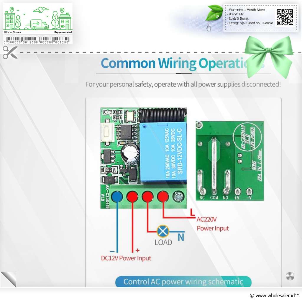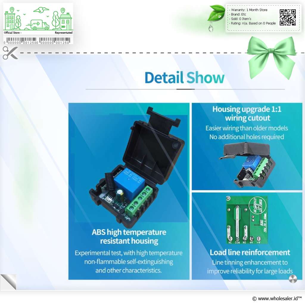| Kompatibilitas Luas Bekerja pada frekuensi 433 MHz, receiver ini dapat dihubungkan ke berbagai perangkat otomatis seperti gerbang rumah, pintu garasi, gorden elektrik, lampu taman, hingga sistem keamanan kantor. Frekuensi ini adalah standar industri yang umum digunakan, memastikan receiver mudah dipasangkan dengan berbagai jenis remote kontrol di pasaran. |