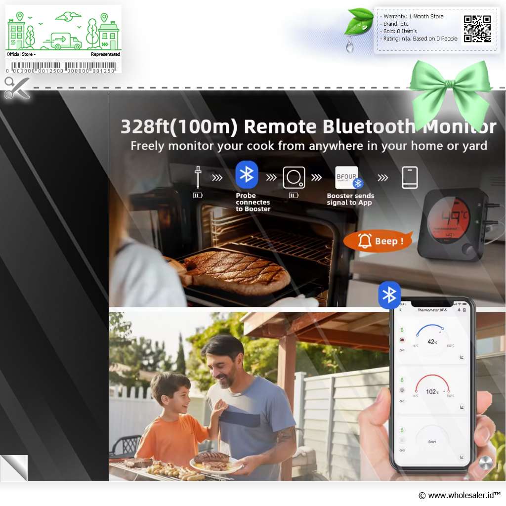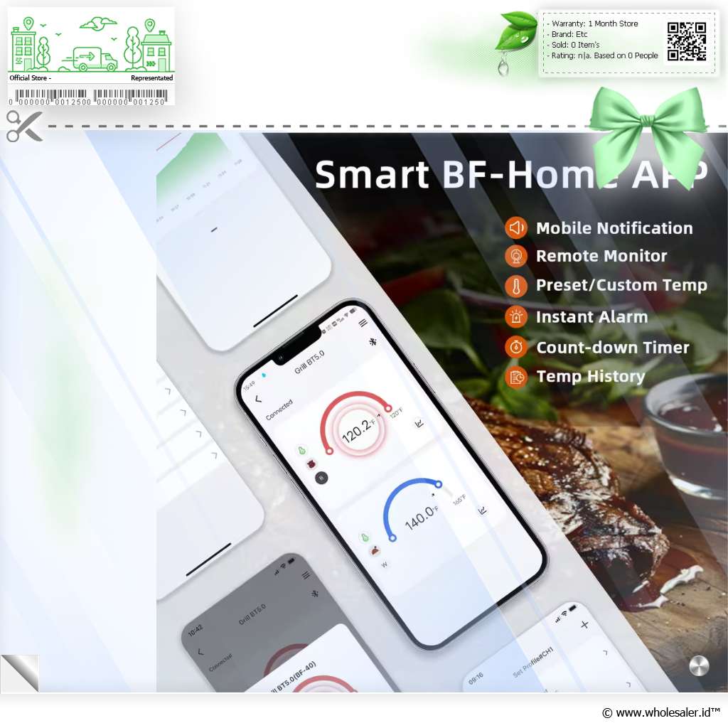 | Koneksi Bluetooth 5.0 Dengan teknologi Bluetooth 5.0 yang stabil, Jinutus bisa dihubungkan langsung ke smartphone Anda melalui aplikasi BF Home atau Grill5.0. Jarak operasional hingga 100 M memberi Anda kebebasan bergerak tanpa kehilangan koneksi. Anda dapat memantau suhu masakan, mengatur alarm, hingga melacak grafik suhu secara real-time langsung dari layar ponsel. |