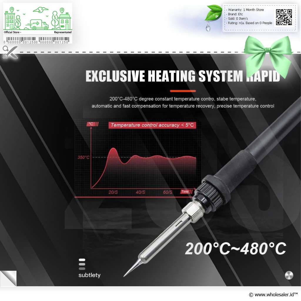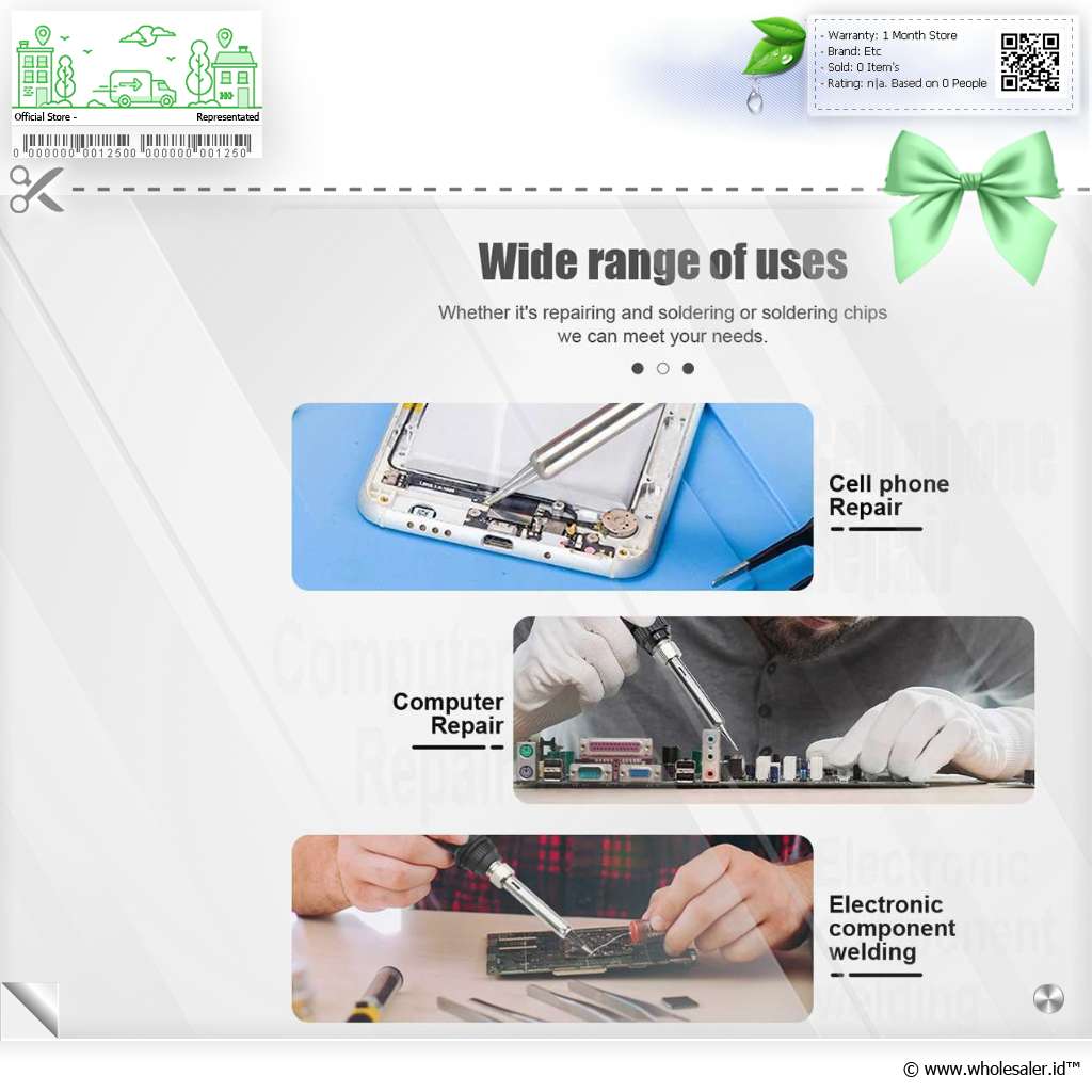 | Perlindungan ESD Safe Dilengkapi fitur ESD Safe (Electro Static Discharge) yang melindungi rangkaian elektronik dari lonjakan listrik statis. Fitur ini membantu mencegah pelepasan muatan listrik statis yang dapat merusak IC, transistor, dan chip mikroelektronik. Solder biasa tidak memiliki perlindungan ini, sehingga berisiko merusak IC atau chip sensitif. |