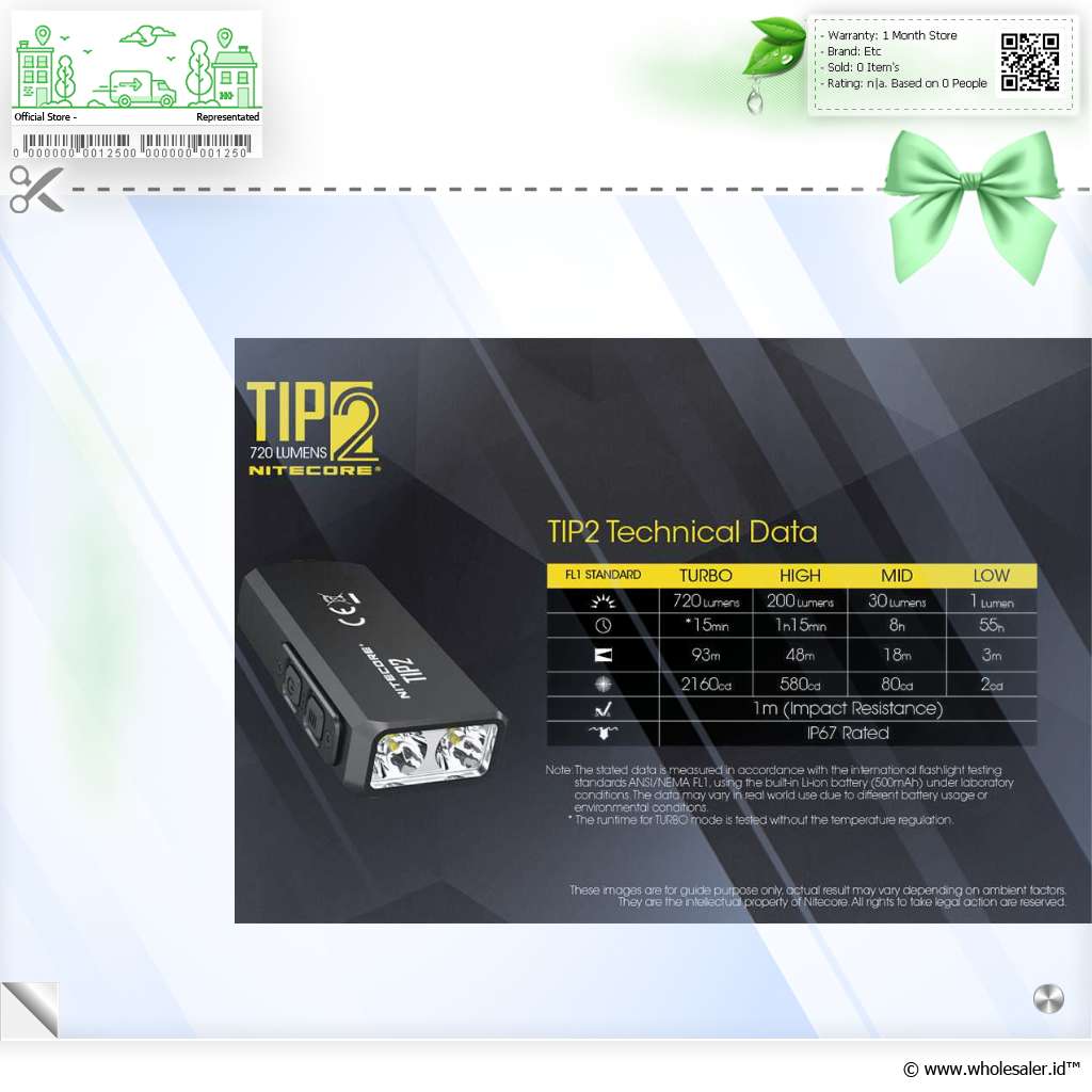 Dengan ukurannya sangat kecil, senter Nitecore TIP2 ini mampu memancarkan cahaya LED hingga 720 Lumens dengan jarak terjauh 93 M. Nitecore TIP2 sudah dibekali baterai USB isi ulang sehingga Anda dapat menghemat biaya baterai.