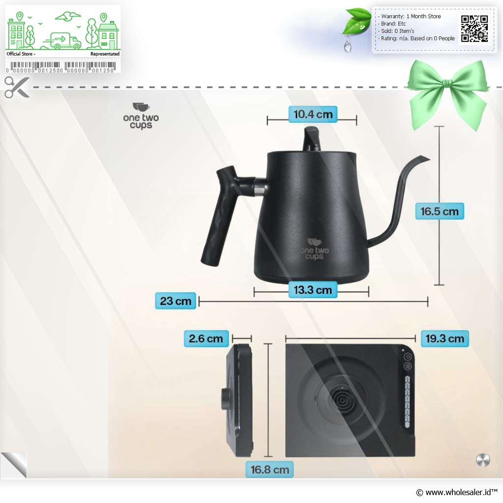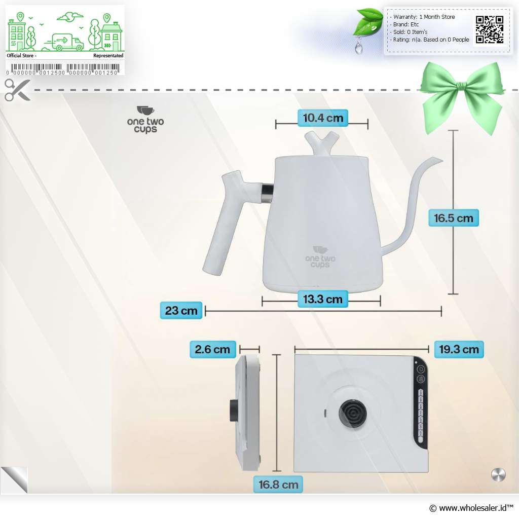 | Dimensi | : | Diameter Atas Teko 10.4 cm Diameter Bawah Teko 13.3 cm Lebar Keseluruhan Teko 23 cm Tinggi Teko dengan Tutup 16.5 cm Dimensi Base 16.8 x 19.3 x 2.6 cm Panjang Kabel EU Sekitar 95 cm |