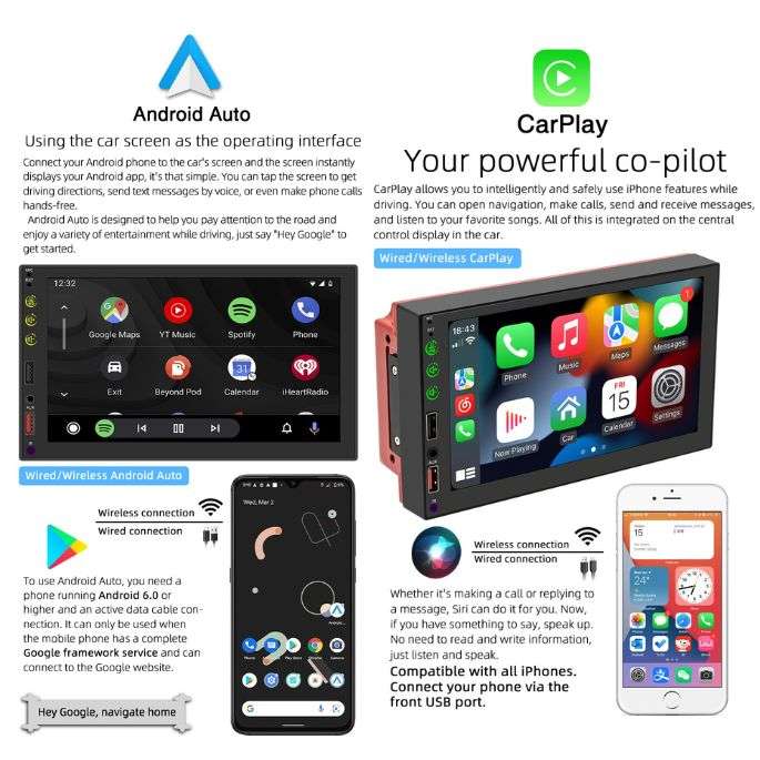 Pindahkan Layar Smartphone Anda Tak perlu lagi gunakan stand handphone jika Anda memiliki head unit double DIN ini. Head unit dibekali dengan teknologi screen mirror yang memungkinkan penggunaan Android Auto atau Apple CarPlay. Saatnya pindahkan layar smartphone Anda dan akses melalui layar head unit. |