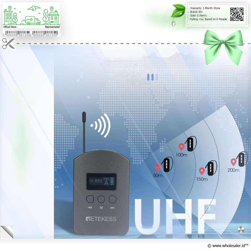 Dilengkapi dengan layar LED, jarak transmisi 250 M, baterai 2000 mAh, dan mampu terhubung ke 36 channel. Kompatibel dengan audio tour guide receiver RETEKESS TT111.