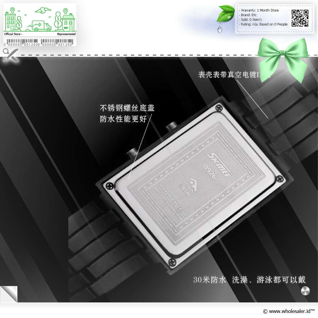 | Water Resistant 30m Jam tangan waterproof SKMEI 0926 memiliki fitur waterproof. Informasi lebih lengkap mengenai waterproof dapat Anda lihat pada bagian bawah. |