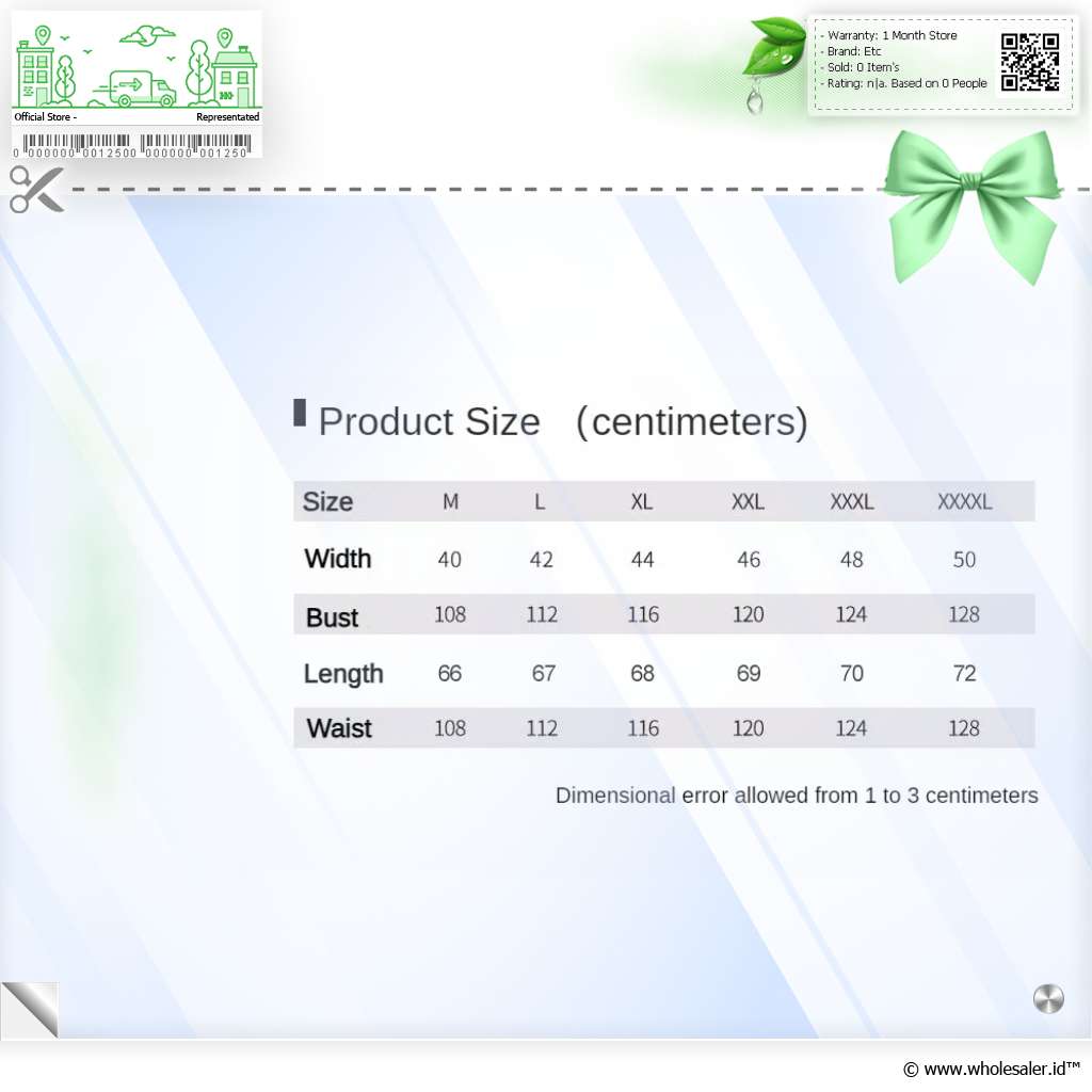 Dimensi | : | XL Lebar 44 cm Lingkar Dada 116 cm Panjang 68 cm Lingkar Pinggang 116 cm |