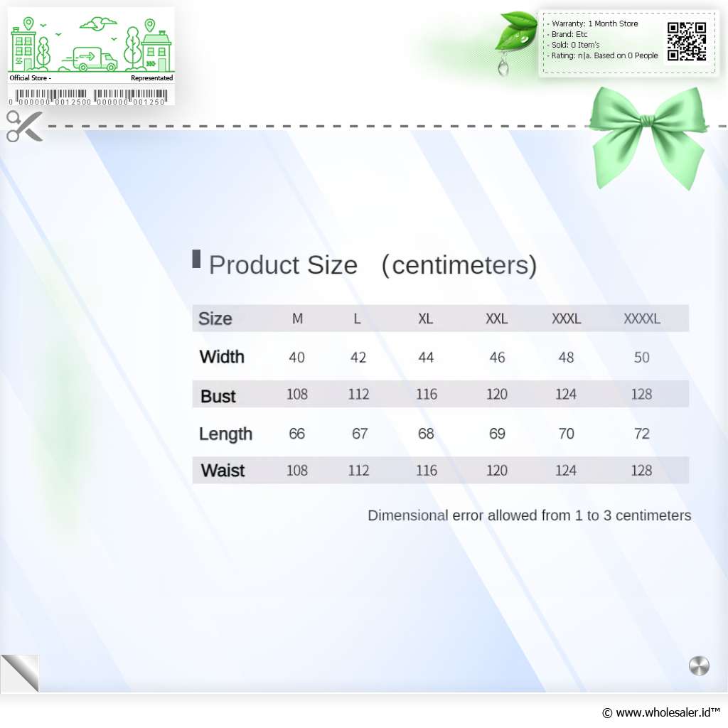 Dimensi | : | XL Lebar 44 cm Lingkar Dada 116 cm Panjang 68 cm Lingkar Pinggang 116 cm |