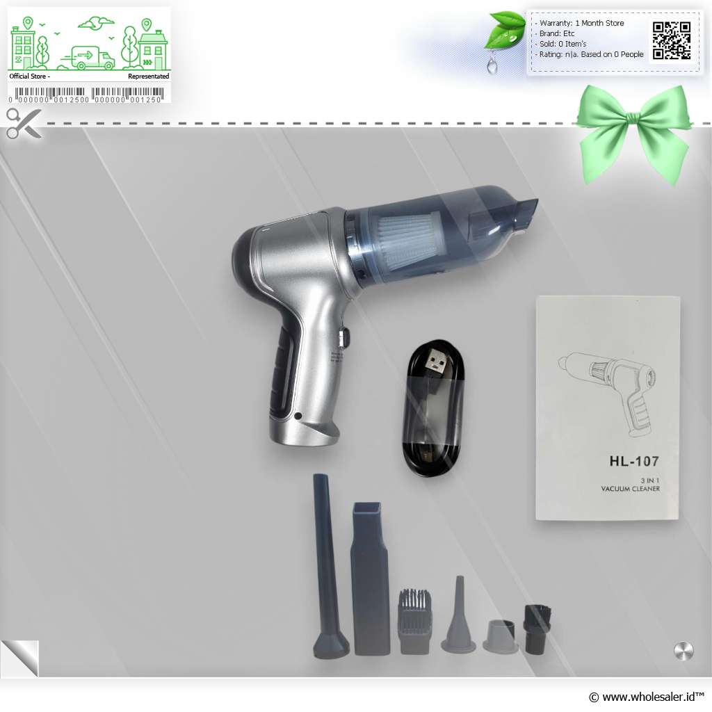 | Dimensi | : | Bodi Vacuum Cleaner 213 x 165 x 65 mm Flat Long Suction Nozzle - Panjang 130 mm - Lebar Lubang 18 mm Long Blowing Nozzle - Panjang 140 mm - Diameter Lubang 10 mm Thick Long Suction Nozzle 30 x 60 mm Small Round Suction Nozzle 30 x 22 mm Diameter Kepala Sikat Bulat 20 mm Kepala Sikat Kotak 38 x 20 mm Panjang Kabel USB Type C 75 cm |