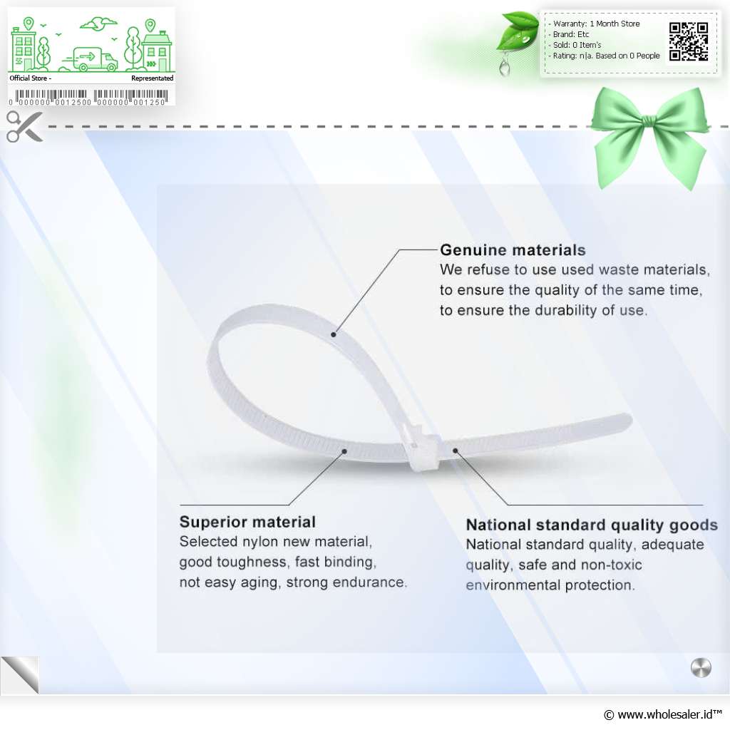 Terbuat dari Material Nilon Berkualitas Menggunakan material nilon 66 dengan kualitas terbaik sehingga memiliki daya tahan yang lebih baik dibanding kabel ties sejenis. Dijamin awet untuk penggunaan jangka panjang dalam waktu yang lama. |
