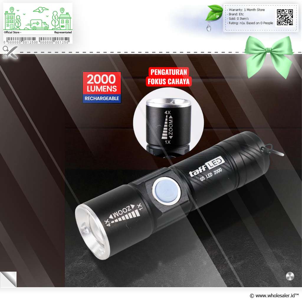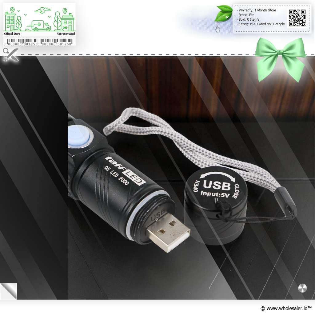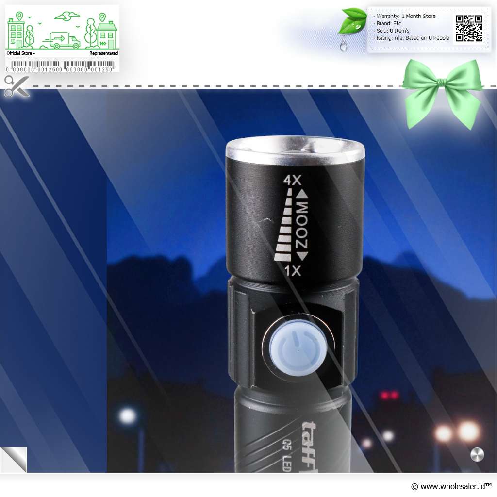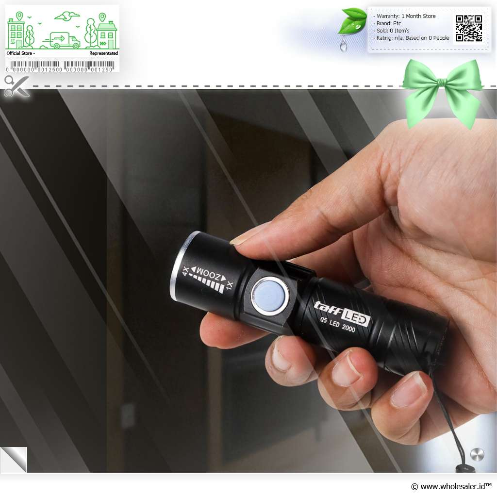 Dukung kegiatan luar ruangan ataupun kebutuhan pribadi Anda dengan senter dari TaffLED. Senter LED ini menggunakan LED Q5 yang dapat menghasilkan cahaya hingga 2000 Lumens. Selain itu senter ini sudah dilengkapi dengan plug USB pada bagian belakang sehingga dapat mengisi ulang langsung dengan mencolok senter ini ke USB seperti komputer.