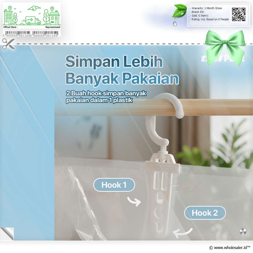 | Simpan Lebih Banyak Pakaian Hanger plastik vakum pakaian dilengkapi 2 hook yang bisa digunakan untuk menyimpan banyak pakaian. Cukup 1 plastik untuk simpan beberapa jaket sekaligus. |