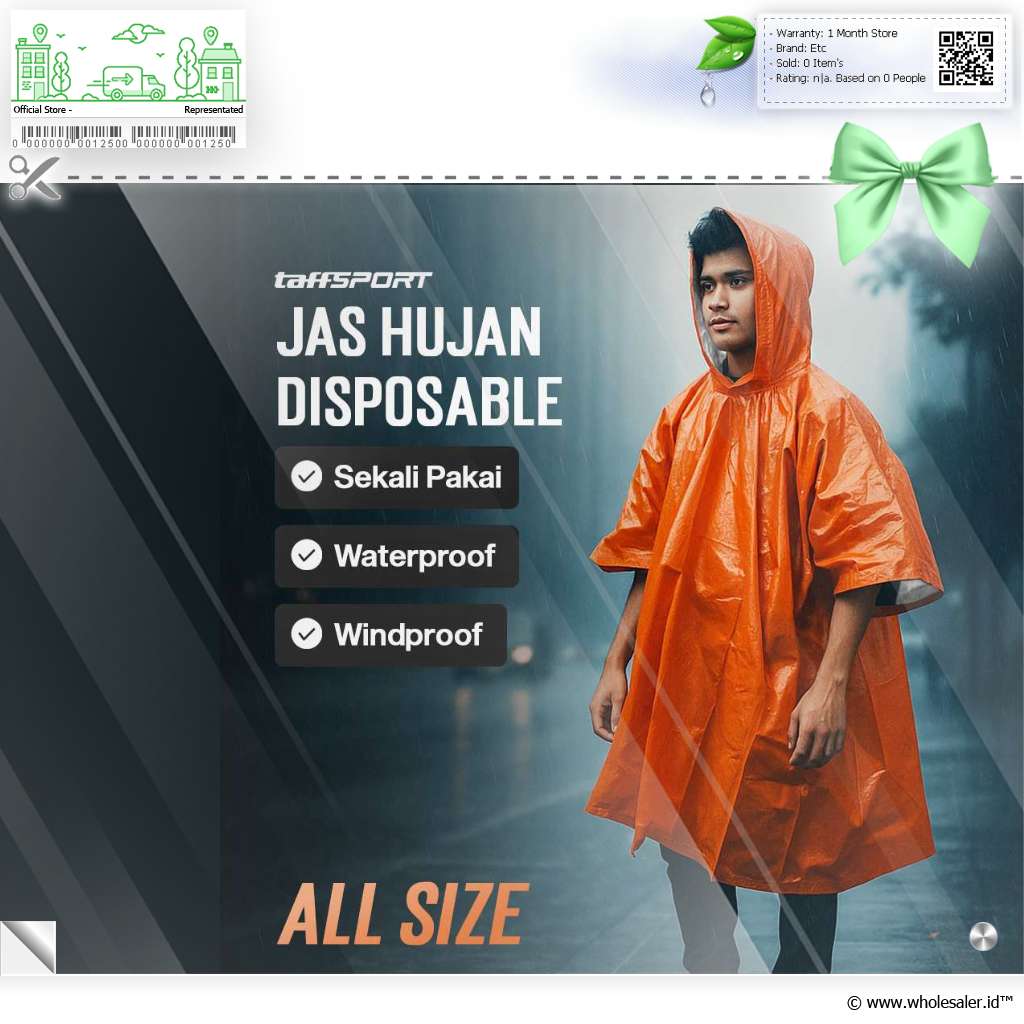 Lindungi tubuh dari guyuran air hujan saat berkendara dengan menggunakan jas hujan sekali pakai dari Taffaware. Menawarkan model poncho, jas hujan ini mudah digunakan dan dapat melindungi tubuh dengan maksimal. Bahan PE dengan lapisan aluminium film waterproof 100% memastikan tidak ada air yang masuk membasahi baju atau tubuh.