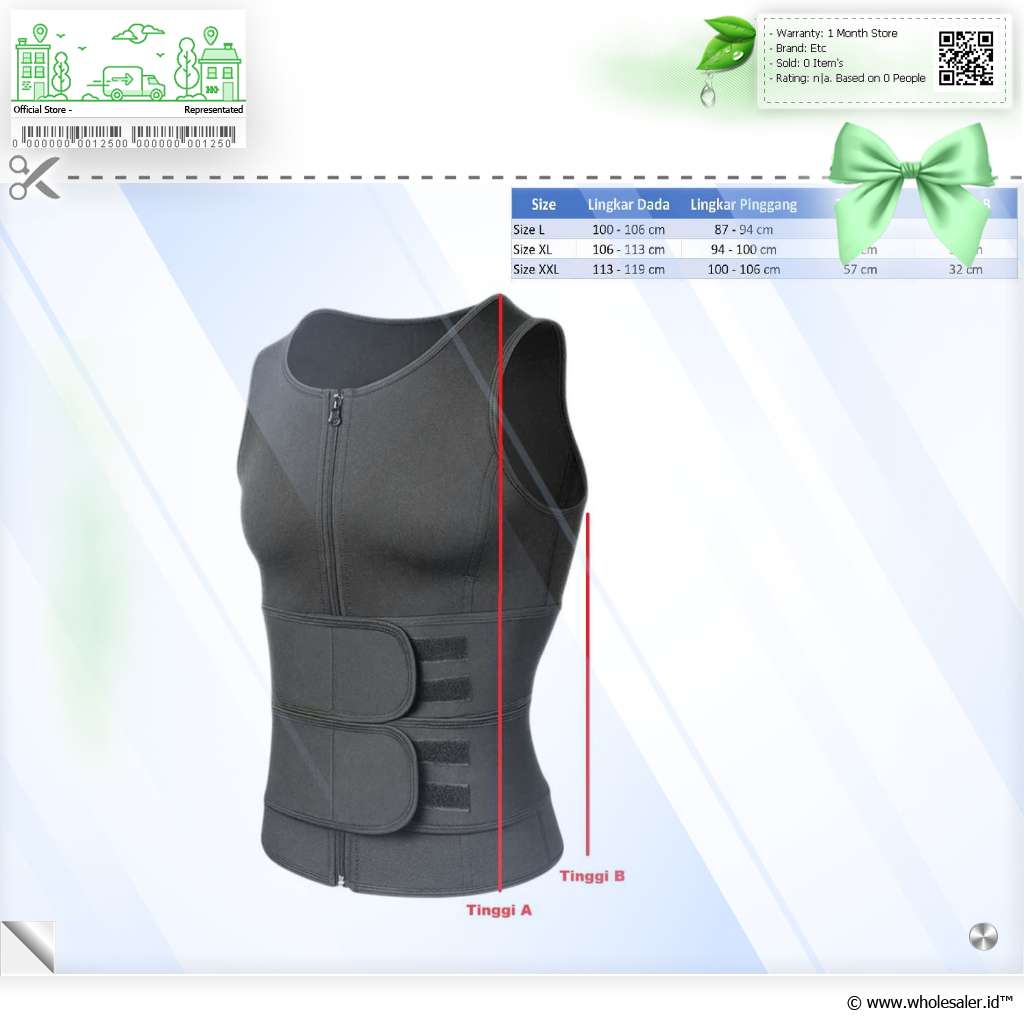 | Dimensi | : | XXL - Lingkar Dada 113 - 119 cm - Pinggang 100 - 106 cm XL - Lingkar Dada 106 - 113 cm - Pinggang 94 - 100 cm L - Lingkar Dada 100 - 106 cm - Pinggang 87 - 94 cm |