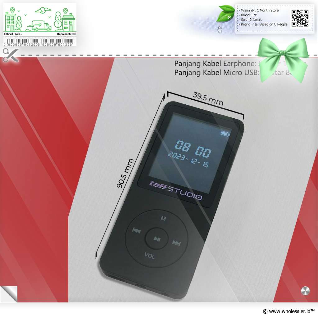 | Dimensi | : | Audio Player 39.5 x 9 x 90.5 mm Panjang Kabel Earphone Sekitar 100 cm Panjang Kabel Micro USB Sekitar 80 cm |