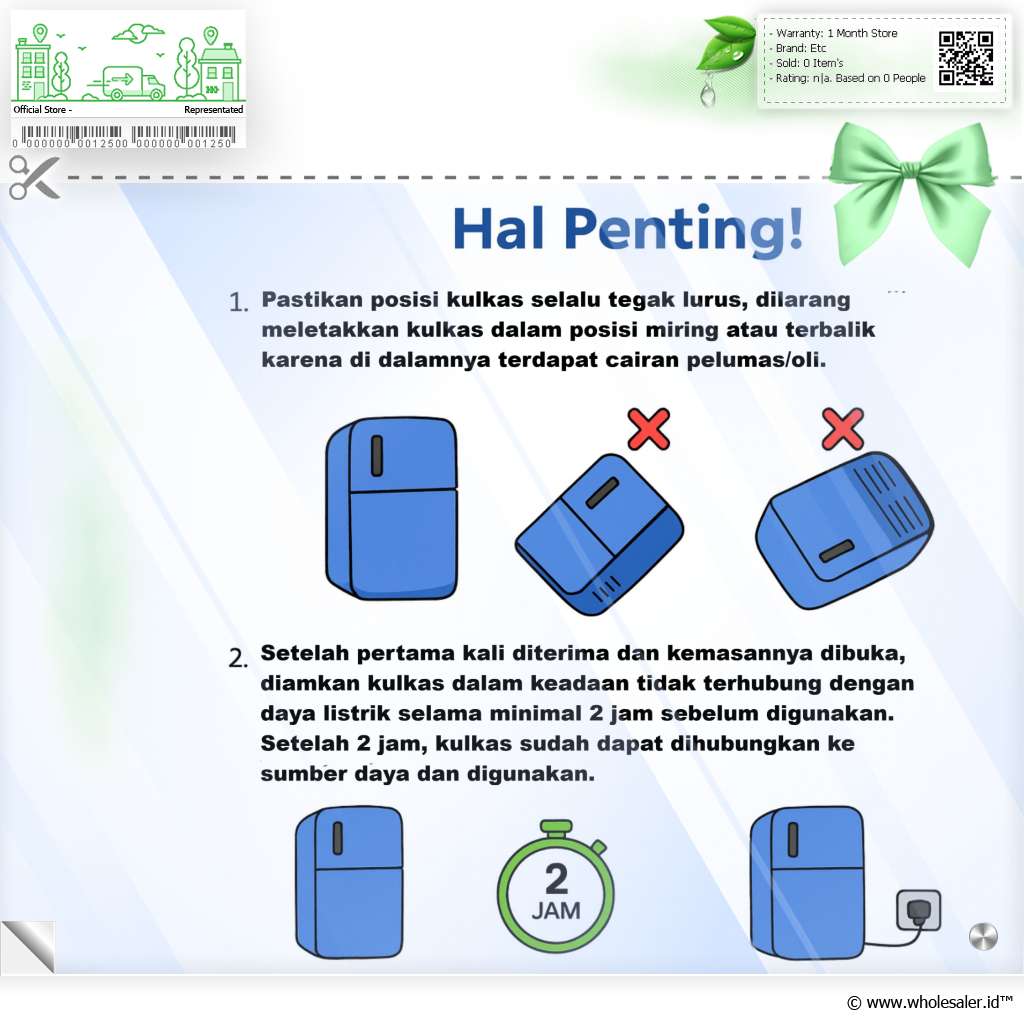 - Pastikan kulkas dalam posisi horizontal saat dinyalakan.