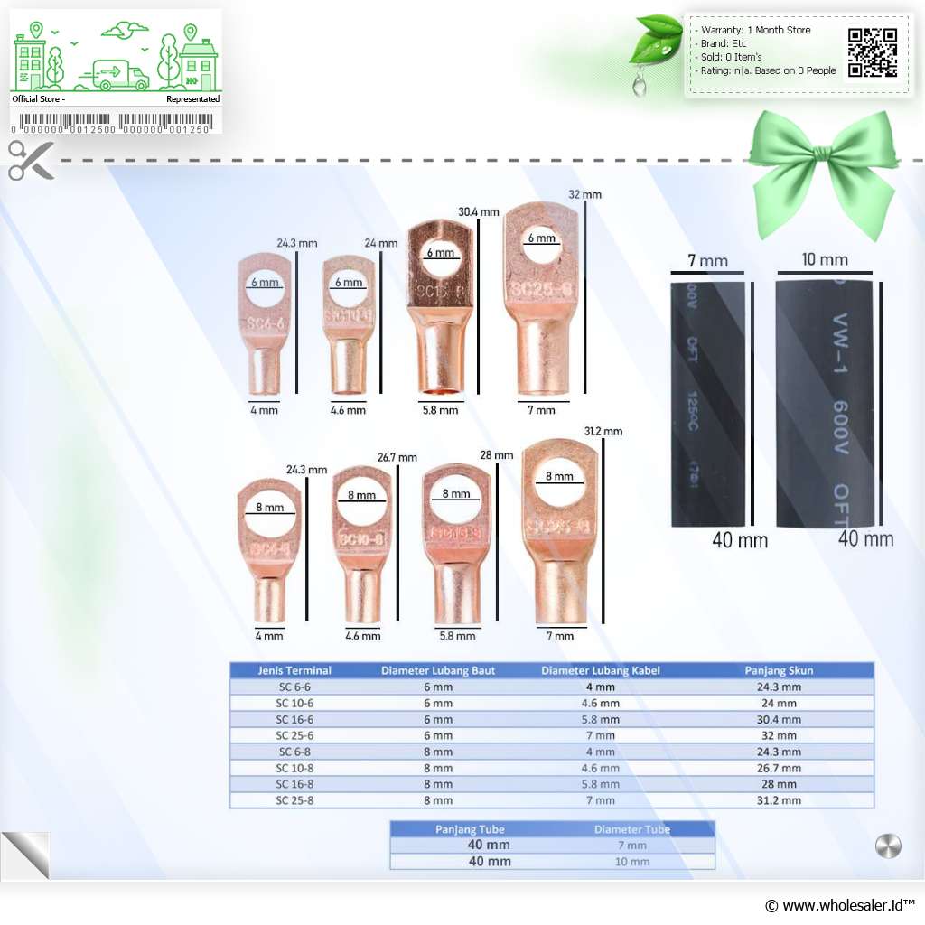 Dimensi | : | Skun SC 6-6 - Panjang 24.3 mm - Diameter Lubang Baut 6 mm - diameter Lubang Kabel 4 mm Skun SC 10-6 - Panjang 24 mm - Diameter Lubang Baut 6 mm - diameter Lubang Kabel 4.6 mm Skun SC 16-6 - Panjang 30.4 mm - Diameter Lubang Baut 6 mm - diameter Lubang Kabel 5.8 mm Skun SC 25-6 - Panjang 32 mm - Diameter Lubang Baut 6 mm - diameter Lubang Kabel 7 mm Skun SC 6-8 - Panjang 24.3 mm - Diameter Lubang Baut 8 mm - diameter Lubang Kabel 4 mm Skun SC 10-8 - Panjang 26.7 mm - Diameter Lubang Baut 8 mm - diameter Lubang Kabel 4.6 mm Skun SC 16-8 - Panjang 28 mm - Diameter Lubang Baut 8 mm - diameter Lubang Kabel 5.8 mm Skun SC 25-8 - Panjang 31.2 mm - Diameter Lubang Baut 8 mm - diameter Lubang Kabel 7 mm Tube 7 mm - Diameter 7 mm - Panjang 40 mm Tube 10 mm - Diameter 10 mm - Panjang 40 mm Kotak Penyimpanan 21 x 11 x 3 cm |