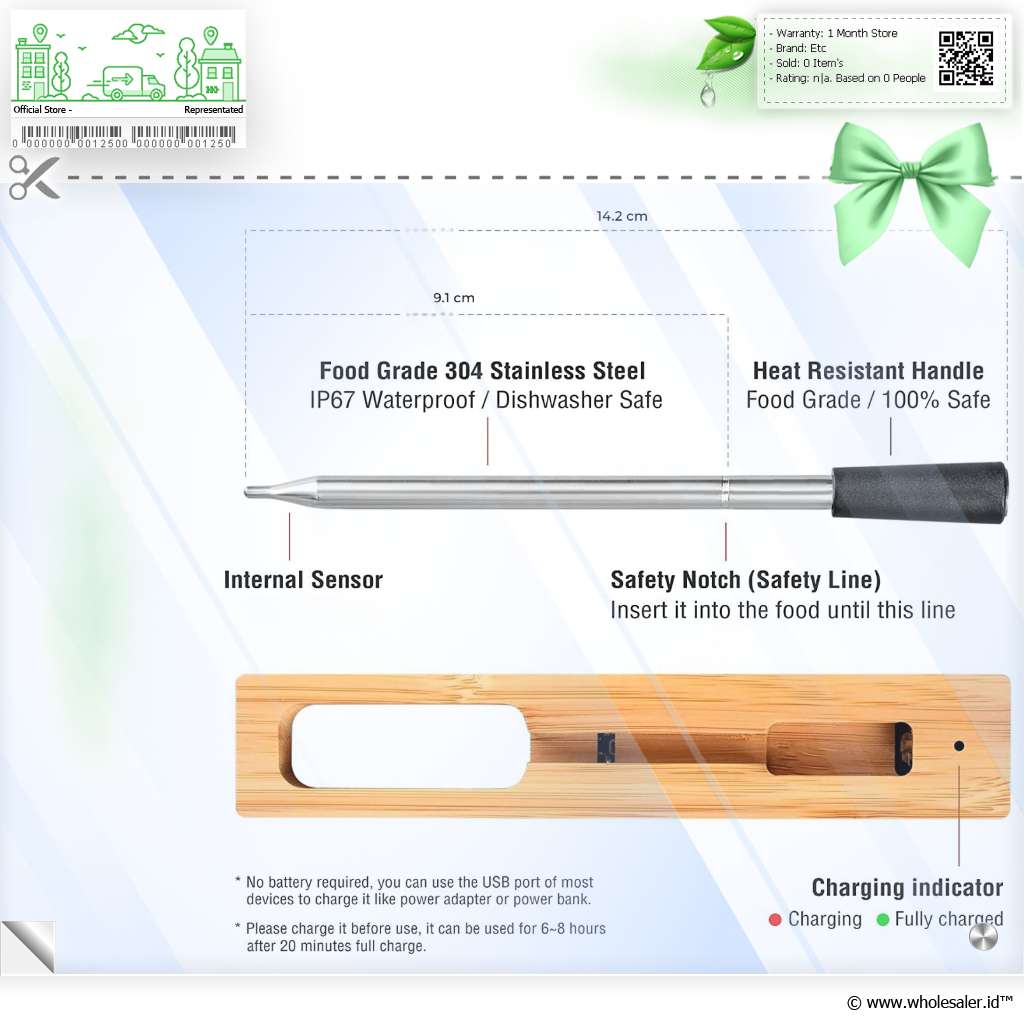 | Single Probe Termometer ini menggunakan single probe, yaitu satu sensor logam presisi tinggi yang berfungsi mendeteksi suhu pada satu titik utama makanan. Probe ini memberikan hasil pembacaan suhu cepat dan stabil, ideal untuk daging panggang, steak, ayam bakar, maupun cairan panas seperti saus dan sup. |