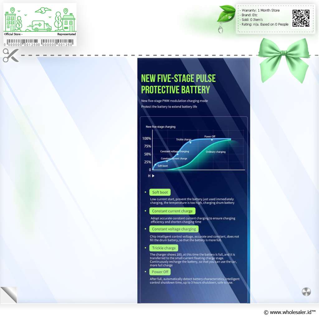 Sistem Pengisian 5 Fase Mengusung teknologi Pulse Width Modulation (PWM), charger ini memberikan 5 tahap pengisian berbeda. Proses dimulai dari soft boot (arus rendah untuk mencegah panas berlebih), lalu constant current charge (arus stabil untuk efisiensi), constant voltage charging (tegangan stabil agar baterai terisi penuh dengan aman), trickle charge (pengisian arus kecil untuk menjaga kapasitas penuh), hingga power off (otomatis mati setelah penuh untuk keamanan). |