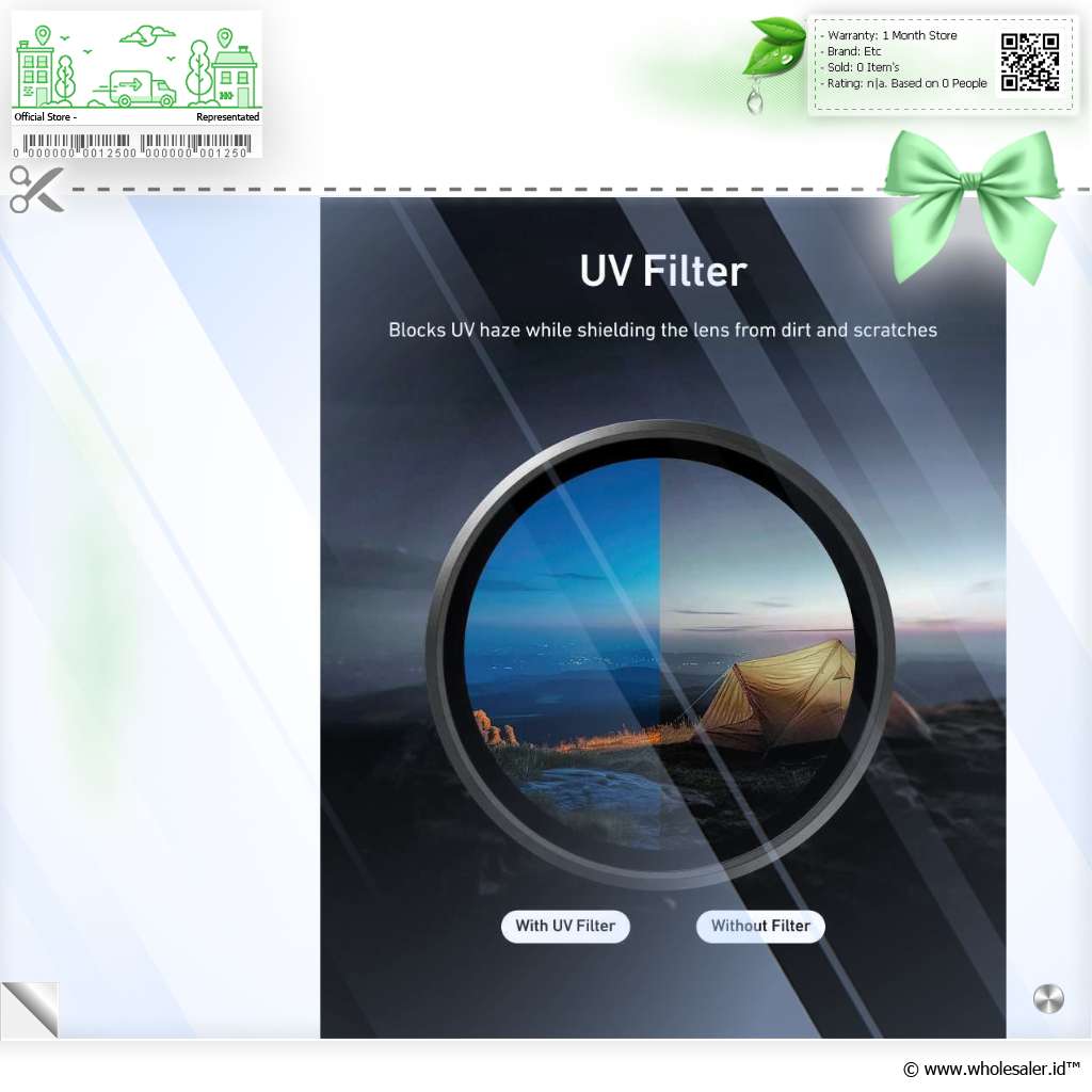 | Perlindungan Sinar UV UV Filter berfungsi sebagai lapisan proteksi utama untuk lensa kamera Anda. Tidak hanya melindungi dari debu, goresan, dan benturan ringan, filter ini juga membantu meminimalkan efek kabut (haze) akibat sinar ultraviolet. Hasilnya, gambar tampak lebih bersih, natural, dan bebas dari distorsi yang disebabkan oleh cahaya UV. |