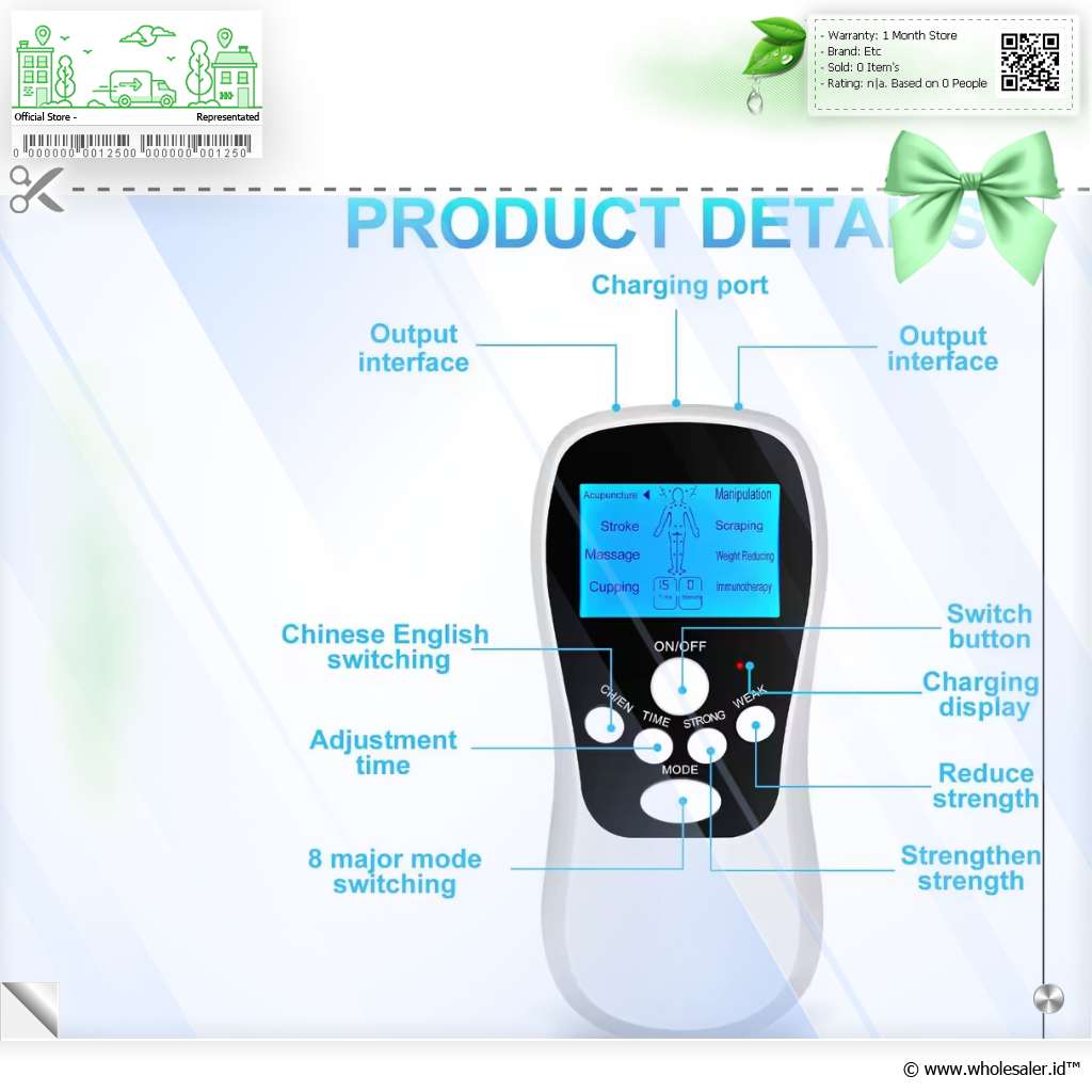Alat pijat elektrik ini adalah solusi terapi pijat portabel dan multifungsi yang menggunakan teknologi akupunktur pulse untuk merangsang titik-titik meridian. Alat pijat mini ini secara efektif melakukan pengerukan meridian dan terapi moxibustion melalui listrik frekuensi rendah, membantu meredakan ketegangan otot dan meningkatkan sirkulasi darah di area yang ditempelkan. Dilengkapi dengan empat electrolade massage pads standar, perangkat ini menawarkan pengalaman pijat yang intensif.